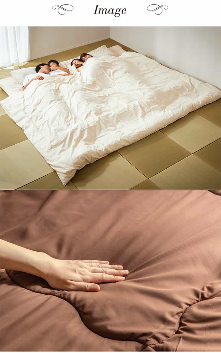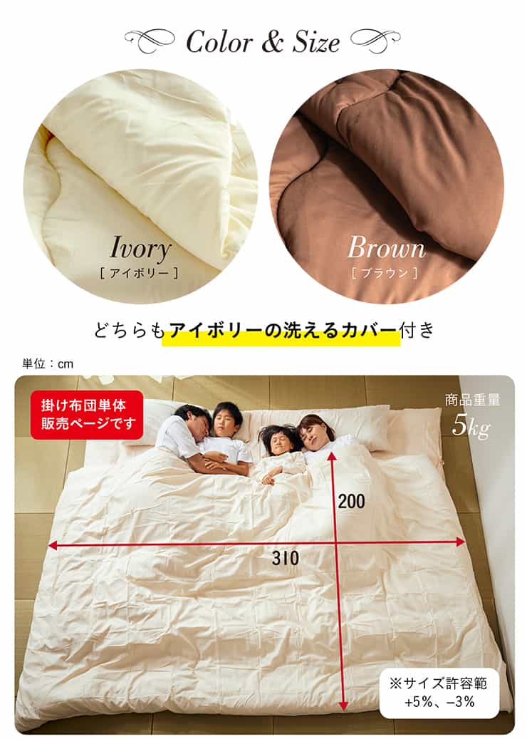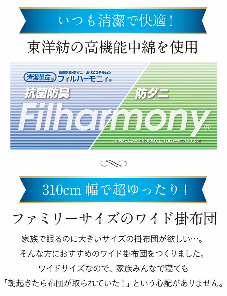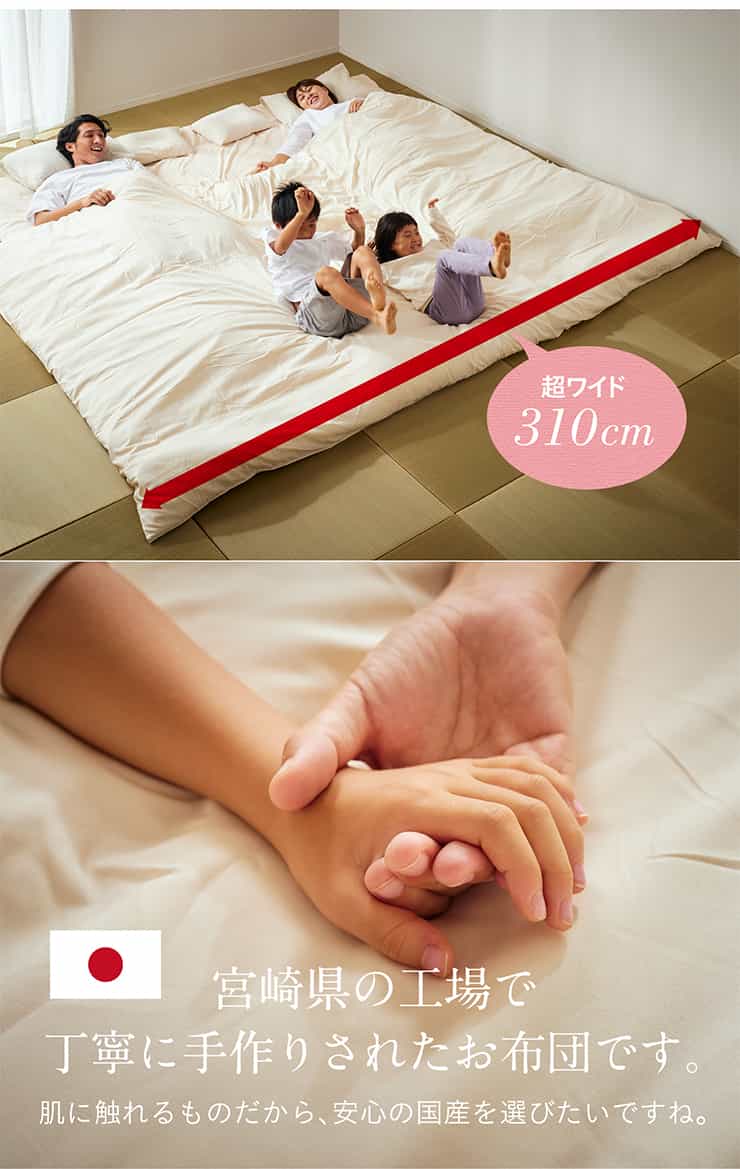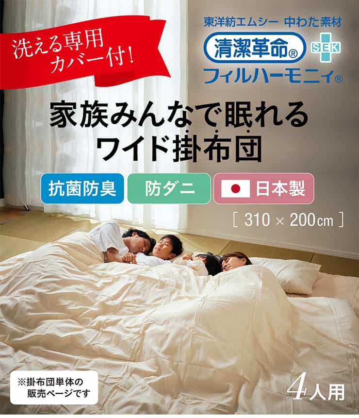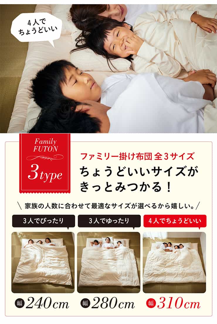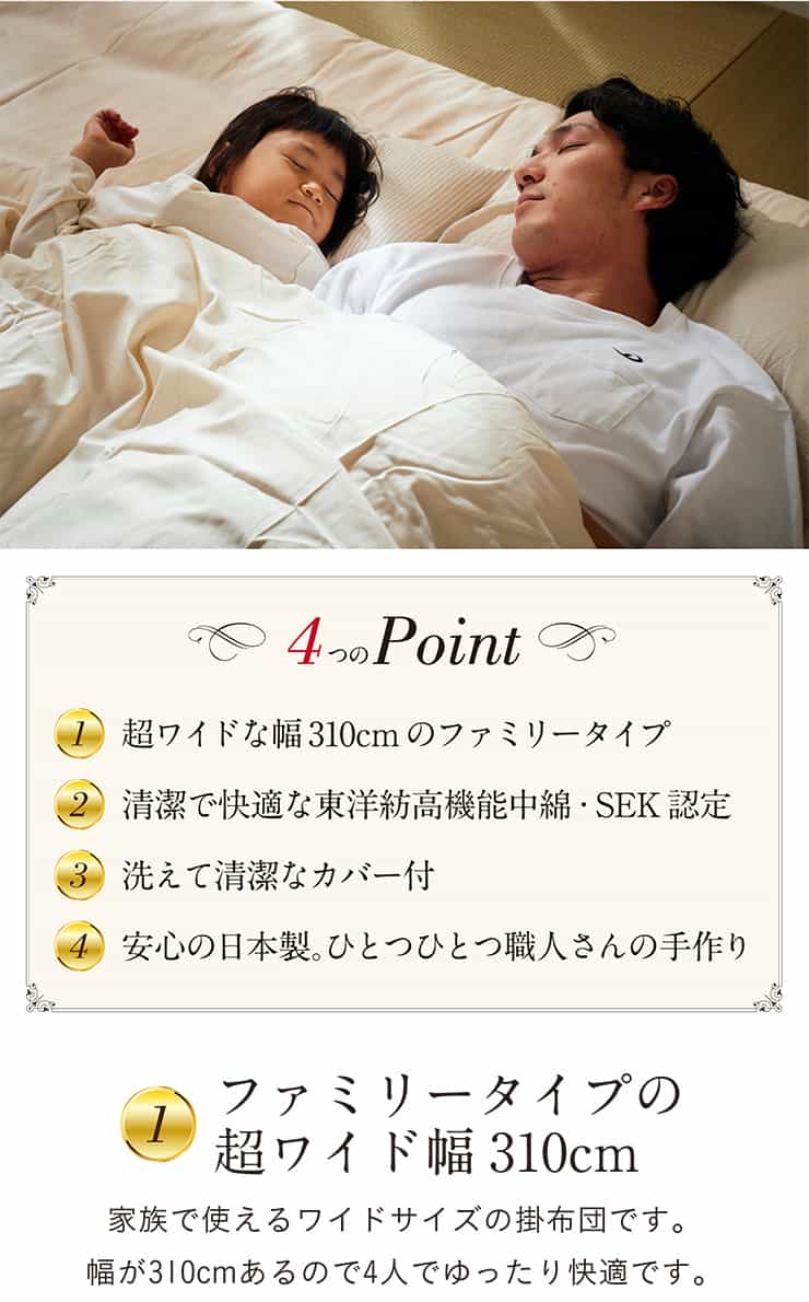いつも清潔で快適、家族3人でちょうどいいファミリータイプのワイド幅310cm掛布団。