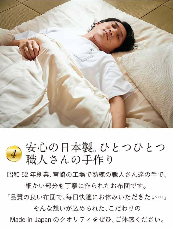 昭和52年創業、宮崎の工場で熟練の職人さんたちの手により、細かい部分も丁寧に作られた羽毛布団です。