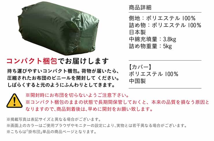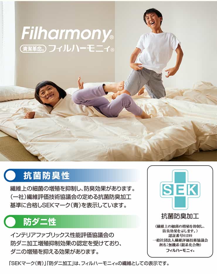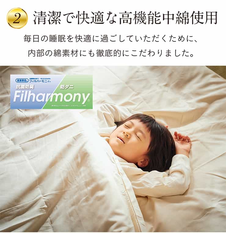 布団の中綿は、抗菌防臭、防ダニの効果のある東洋紡フィルハーモニイを使用。