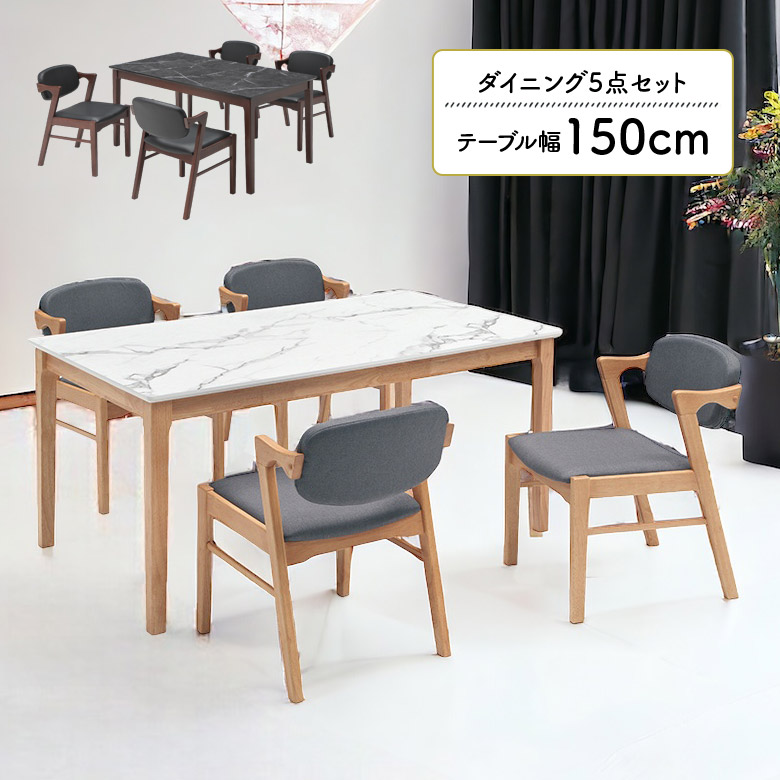 ダイニングテーブルセット 5点セット 150cm 肘付き ダイニングチェア 4脚セット 白 ホワイト 石目調 大理石調 ハーフアーム