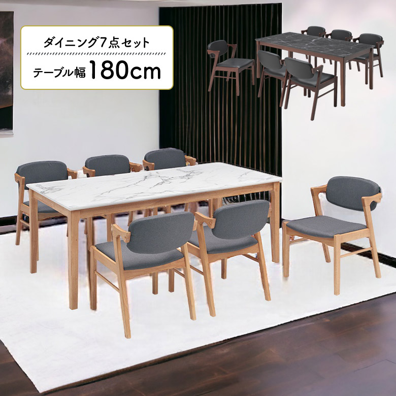 ダイニングテーブルセット 6脚セット 180cm 6人用 肘付き 石目調 大理石調 木製 ダイニングチェア 白 ホワイト