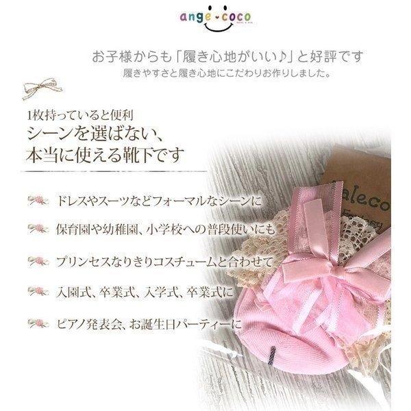 | 商品説明 | サテンリボン&オーガンジーリボンの2つ重ねのリボンに、 生成りのトーションレースも2段がさねに飾った、華やかでかわいらしいソックス。 光沢感のある大きなリボンが付いて可愛く、上品な印象に! どんなお洋服にも合うデザインとお色だから 衣装 ドレスやスーツなどフォーマルなシーンにも大活躍☆ さらに普段にもお使いいただけるデザインですので 様々なシーンにお使いいただける1枚持っているとっても便利な子供靴下です♪ ・ 衣装 ドレスやスーツなどフォーマルなシーンに ・保育園や幼稚園、小学校への通園・通学、普段使いにも ・クリスマス プリンセスなりきりコスチュームと合わせて ・入園式、卒業式、入学式、卒業式に ・ピアノ発表会、お誕生日パーティー、結婚式のお呼ばれに |