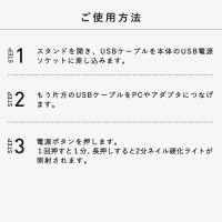 | 使用方法 | 1,スタンドを開きUSBケーブルを本体のUSB電源ソケットに差し込みます。 2,もう片方のUSBケーブルをPCやアダプタにつなげます。 3,電源ボタンを押します。1回押すと60秒、長押しすると120秒間ネイル硬化ライトが照射されます。 |