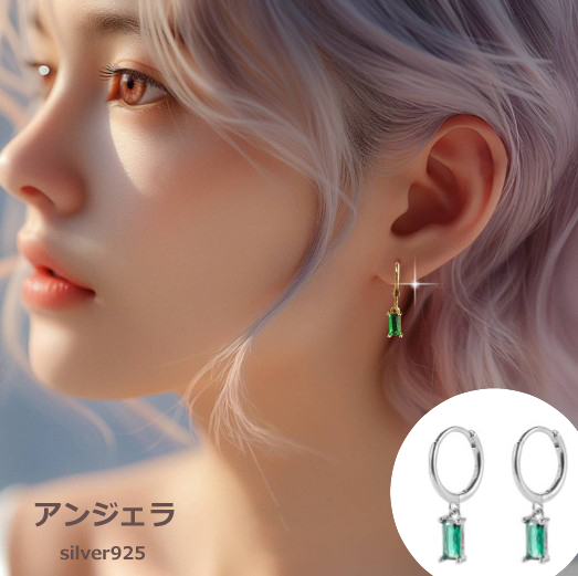 緑色グリーンスクエア長方形CZダイヤモンド・揺れるシンプルデザイン・フープピアス/りングピアス。
