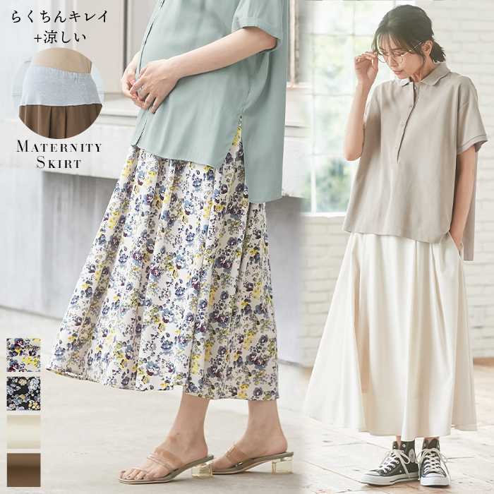マタニティ 服 スカート ライト タック フレアスカート 妊婦服 マタニティスカート 無地 花柄 フラワー キレイめ オシャレ