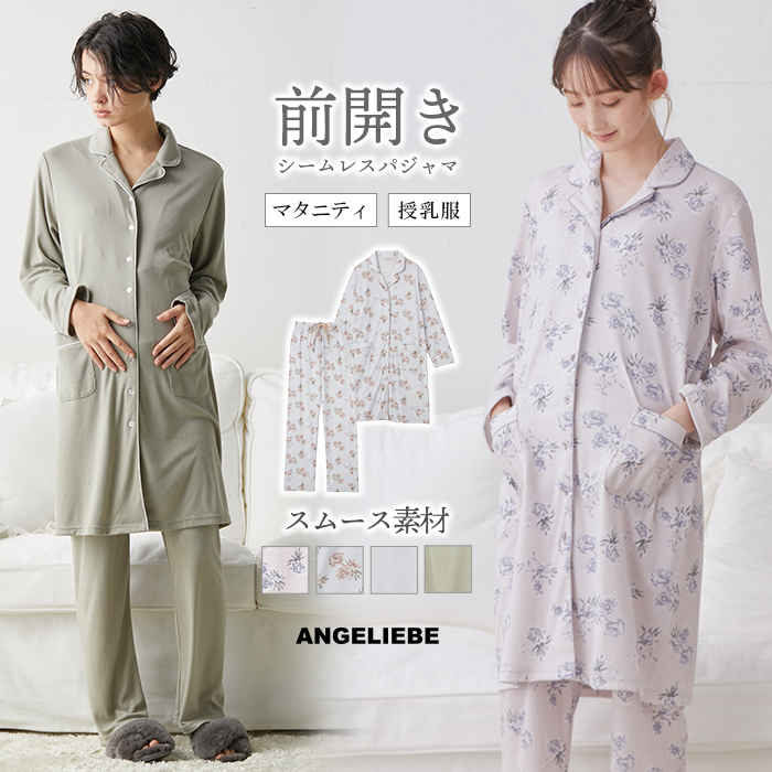マタニティ パジャマ 長袖 前開き 授乳服 妊婦服 親子コーデ 快適 シームレス テーラード スムースパジャマ 花柄 かわいい 無地 エンジェリーベ