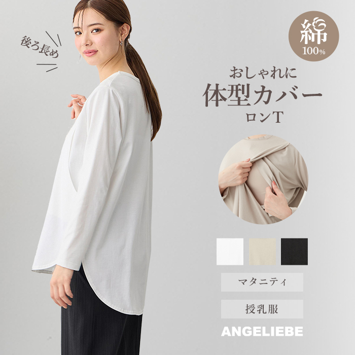 1枚で着たりニットのインに合わせたりと、毎日のコーディネートに大活躍。色違いで揃えたくなるシンプルなロングTシャツです。両サイドに授乳口がついているので、赤ちゃんを待たせることなくサッと授乳できて便利。やや長めの着丈で、裾がシャツテールになっているのもポイントです。 ・肌がデリケートなママも安心のコットン100% ・コーディネートしやすいベーシックな3色展開