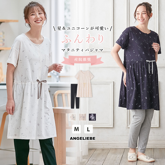マタニティ パジャマ 半袖 前開き ローズマダム 授乳服 スタープリント 天竺 素材 星 ユニコーン 惑星 リボン 部屋着 ルームウェア 臨月 M L エンジェリーベ