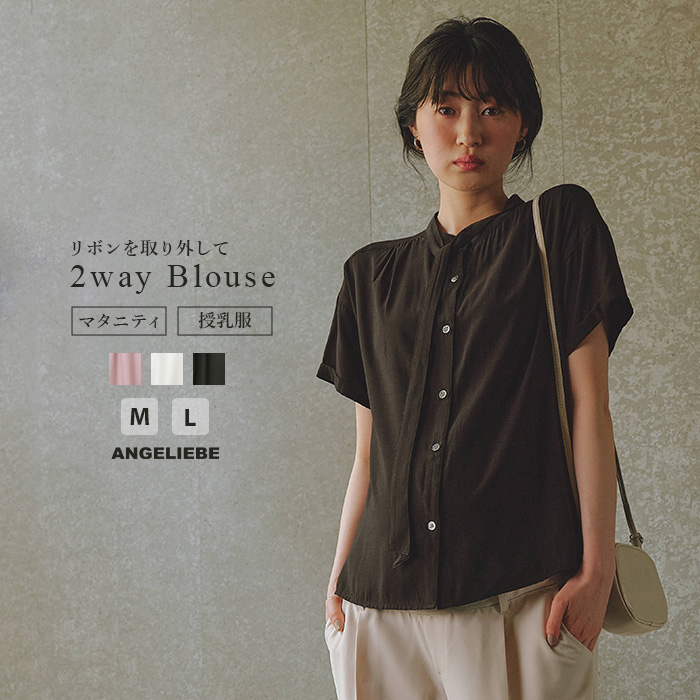 マタニティ トップス 前開き 授乳服 ボウタイ付き 半袖 ブラウス 仕事服 オフィス 通勤 お宮参り M L 無地 シンプル 授乳 シャツ 妊婦服