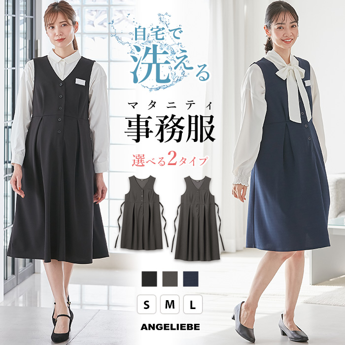 マタニティ ジャンスカ 事務服 仕事服 ワンピース ジャンパースカート 着丈が選べる 洗える 前開き 授乳 オフィス 黒 紺 ブラック エンジェリーベ