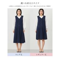 マタニティ期のオフィスコーデにぴったりなベストデザインのワンピースです。ネームプレートをつけたりペンを挿したりするのに便利な胸ポケット付き。フロントボタンがある半開きデザインで着替えもスムーズにできます。ウエスト切り替えタックが縦のラインを強調するから、お腹のラインがすっきり見えるのも魅力です。身長やお好みに合わせて選べる「レギュラー丈」と「ロング丈」の2丈展開です。
