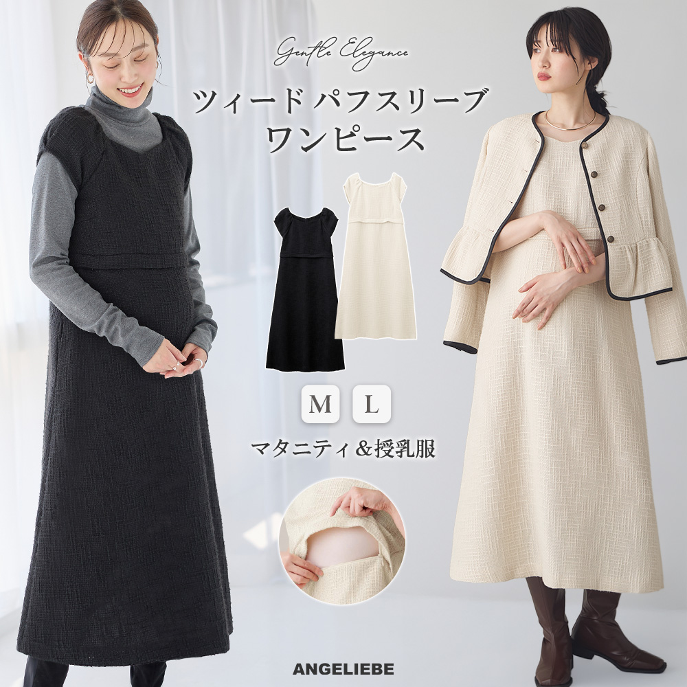 ツィードパフスリーブワンピース マタニティ・授乳服【出産後も長く使える】