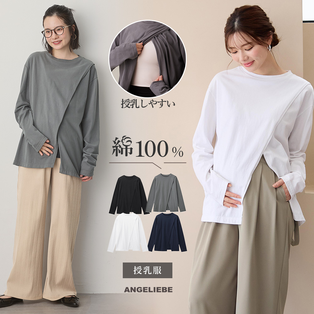 マタニティ トップス カットソー 長袖 授乳服 綿100% クロススリットカットソー 妊婦 服 長そで Tシャツ ブラック ホワイト 白 黒 紺 エンジェリーベ