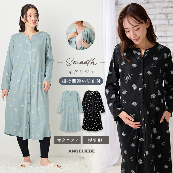 マタニティ パジャマ 長袖 ワンピース 前開き スムース素材 ネグリジェ 総柄 入院着 産院着 授乳服 妊婦服 ブラック ブルー エンジェリーベ