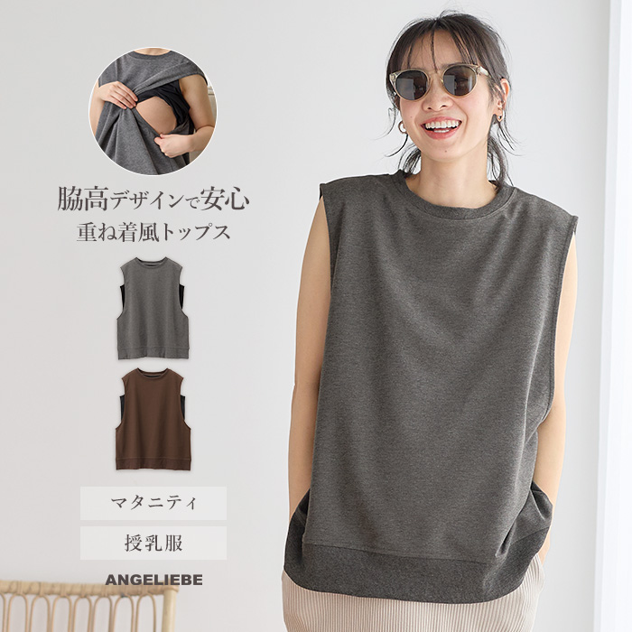 綿混スウェット重ね着風フレンチスリーブトップス マタニティ・授乳服【出産後も長く着られる】