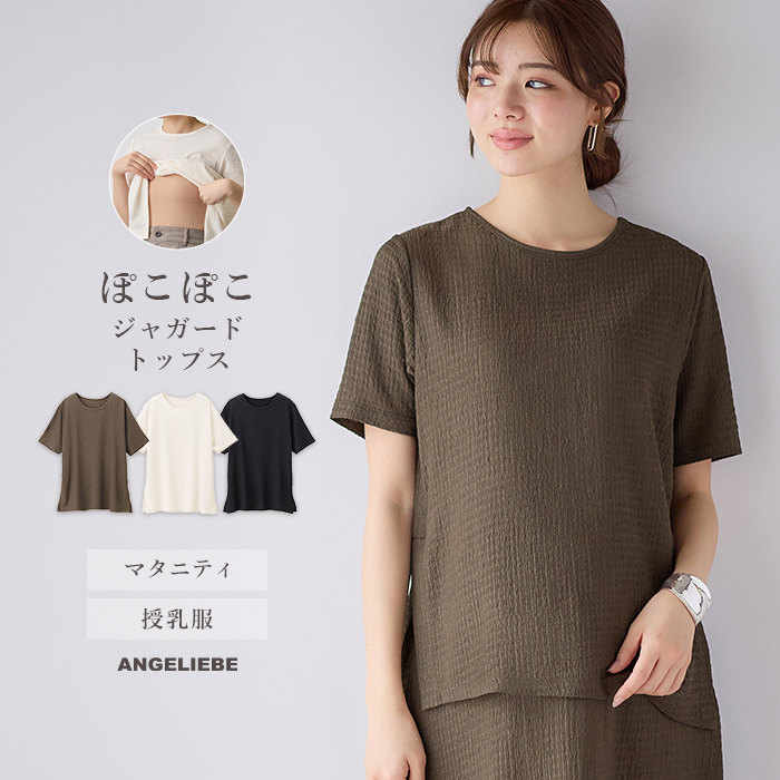 マタニティ トップス 半袖 Tシャツ レディース 授乳服 オシャレ サイド スリット ぽこぽこ ジャガード トップス 妊婦服 授乳服 エンジェリーベ
