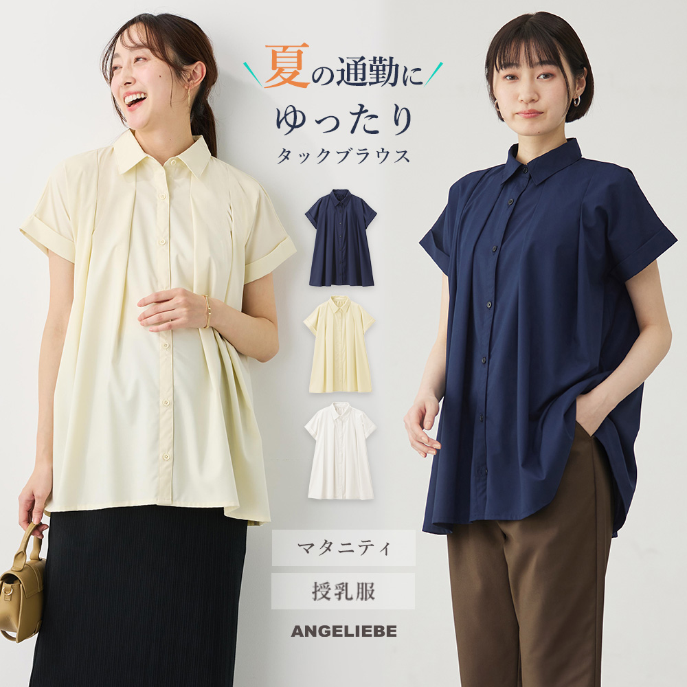 マタニティ トップス 半袖 シャツ 授乳服 ブラウス 前開き 襟付き タックブラウス ゆったり 妊婦服 授乳服 仕事服 通勤 エンジェリーベ