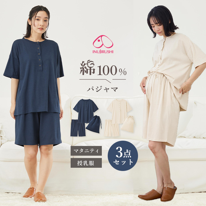 犬印本舗 【オーガニックコットン】綿100% パジャマ3点セット マタニティ・授乳パジャマ【出産後も長く使える】