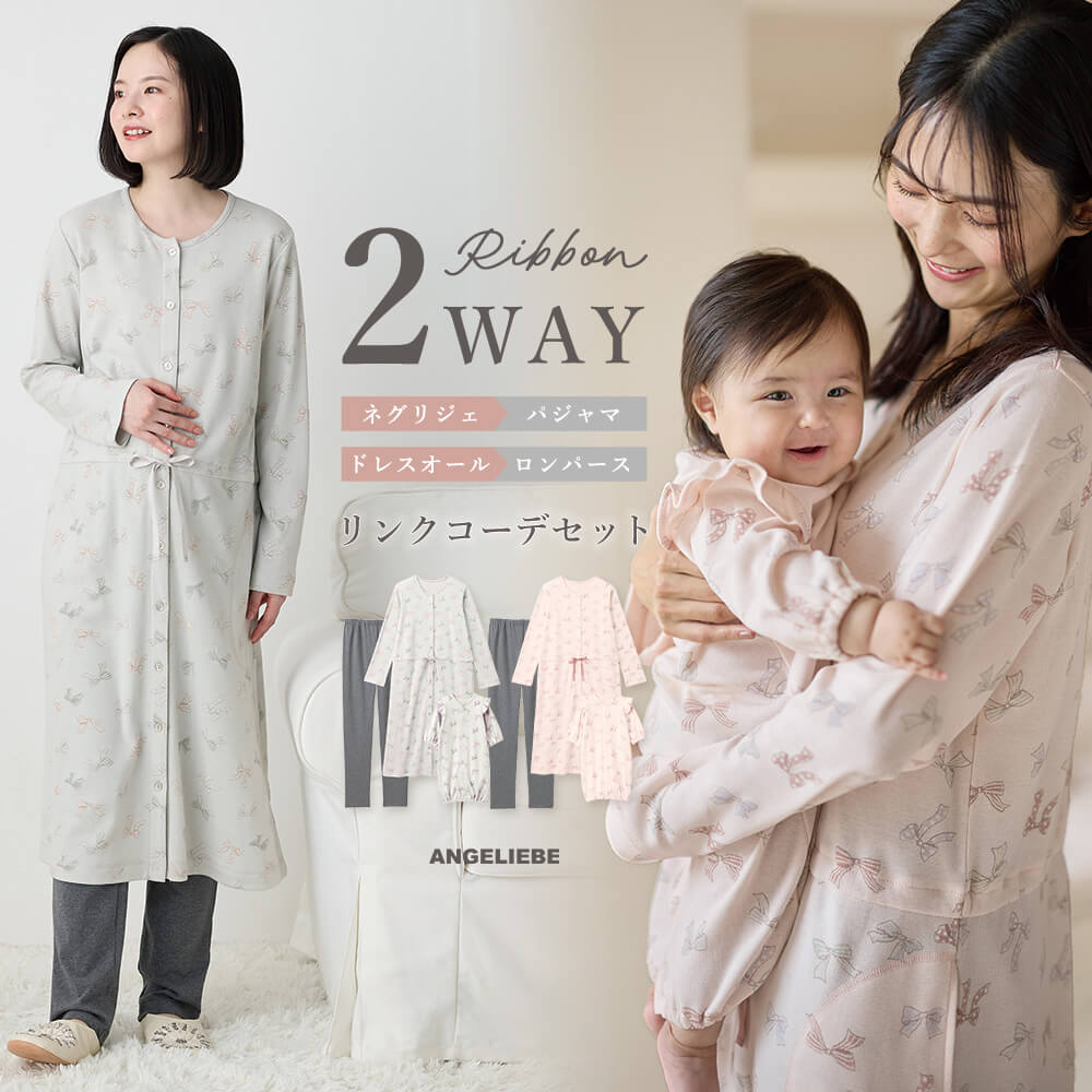 マタニティ ベビー パジャマ 長袖 親子コーデ セット リンクコーデ リボン柄 プリント ワンピ レギンス パジャマ 2wayオール エンジェリーベ