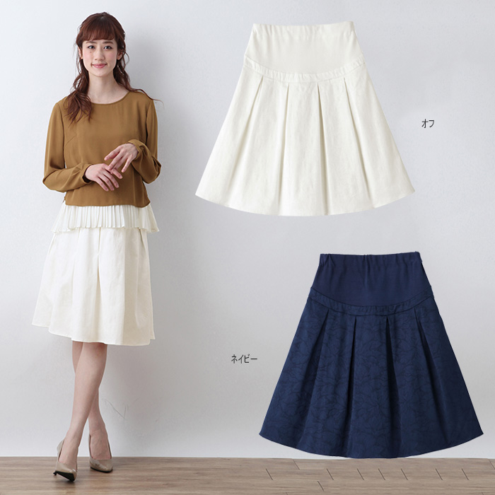 上品なジャガード生地を使った上品スカート。フェミニンな花柄のジャガードなので、大人っぽくゴージャス感も楽しめます。ミモレ丈で普段使いはもちろん、通勤用コーディネートにもぴったり。バンドアジャスターでウエスト調整ができるので長くお使いいただけます。