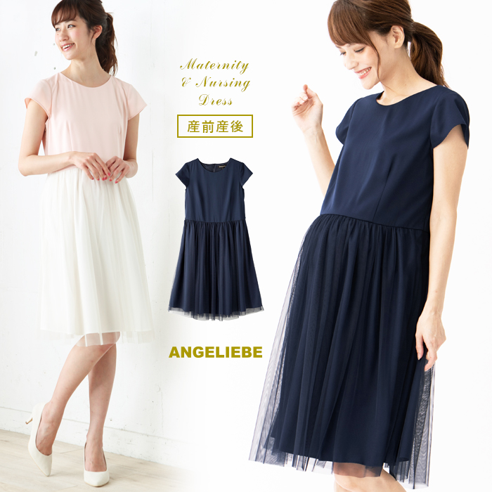 マタニティ ワンピース 授乳口付 異素材チュールスカートワンピース 産前 産後 授乳服 妊婦服 マタニティー 春 夏 春夏 maternity onepiece