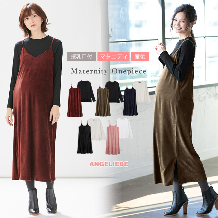 マタニティ トップス スカート 授乳口付 セット ストレッチ細コールベロアキャミワンピース&長袖リブトップスセット 授乳服 ウェア 産前 産後 マタニティー