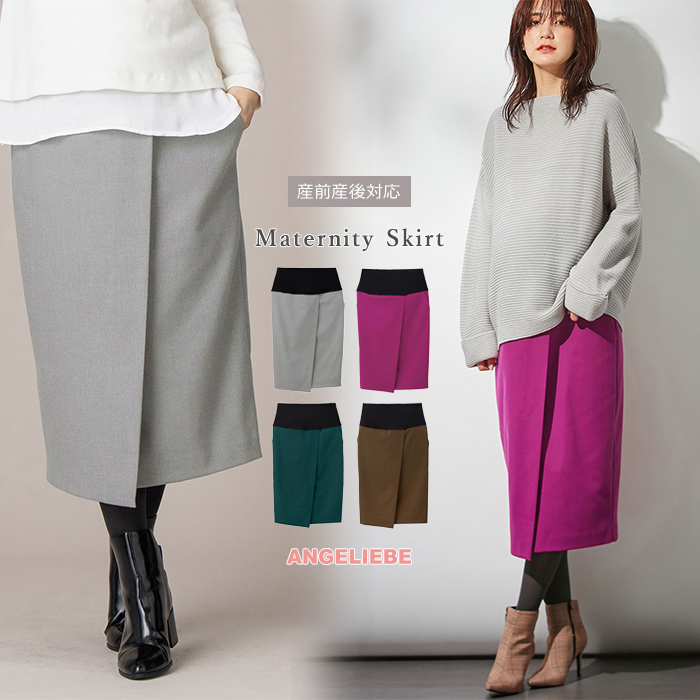 マタニティ 服 スカート 産前産後対応 あったか ラップ風ミディアム丈Iラインスカート 産前 産後 妊婦服