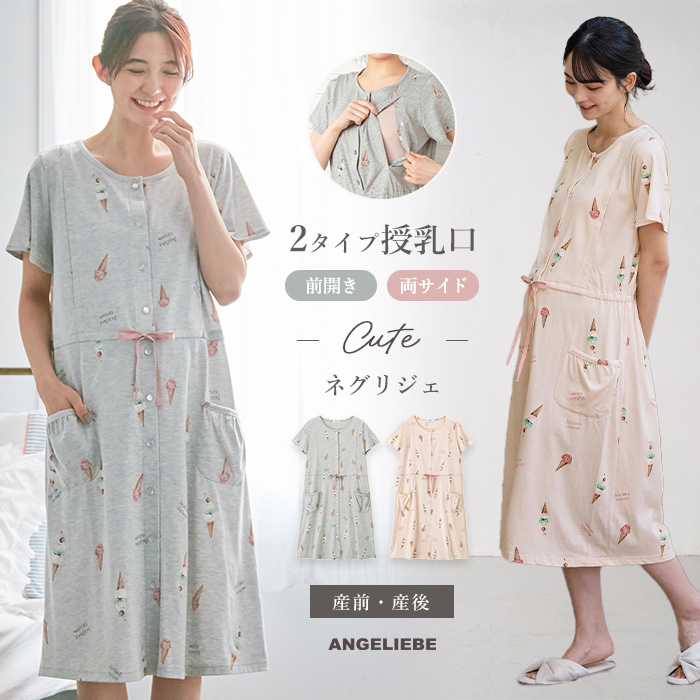 マタニティ パジャマ 半袖 ワンピース 授乳服 授乳口付 アイスクリーム柄 ネグリジェ 妊婦服 人気 オシャレ 可愛い エンジェリーベ