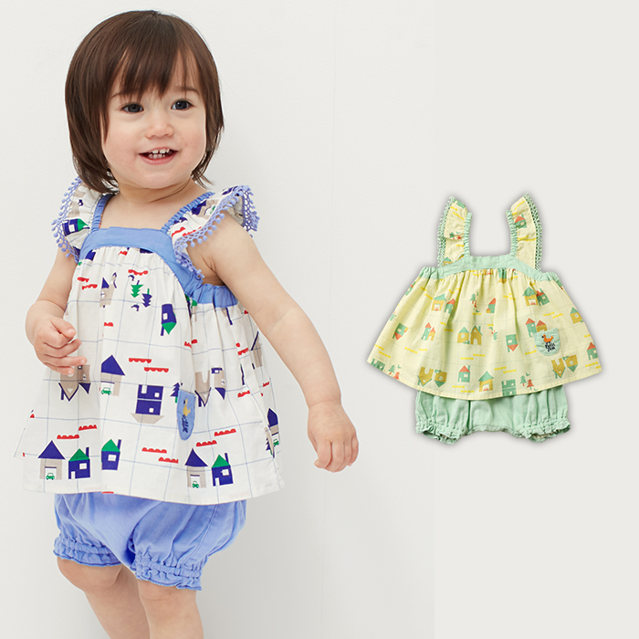 カラフルなおうち柄のキャミソールととブルマをセットに。女の子らしいベビースタイルで写真映え抜群の夏スタイルが完成します。ソフトなブロードとダブルガーゼを使用。さらりとした肌触りと見た目にも涼しそうな風合いで夏休みのお出かけや帰省にもぴったりです。肩フリルのポンポンレースやポケットのトリさん刺繍など、細部にまでこだわりました。