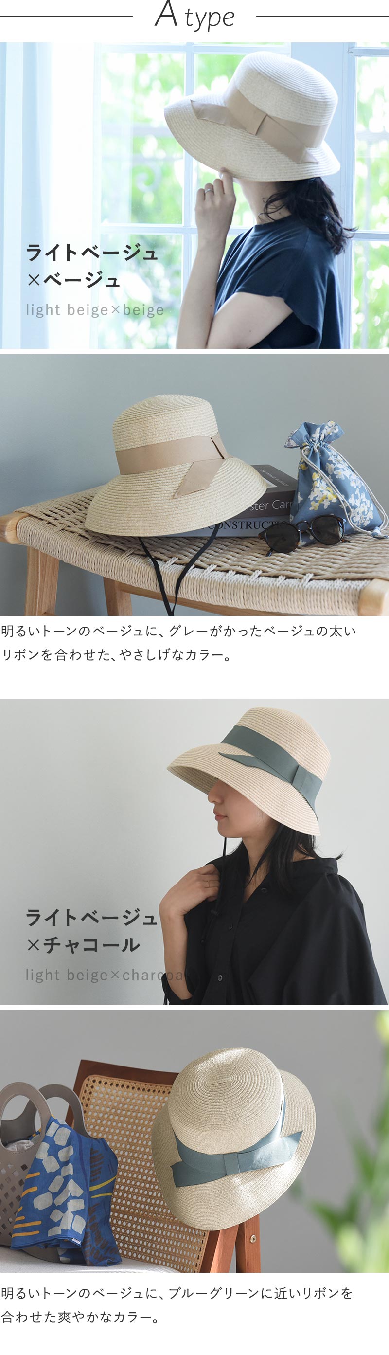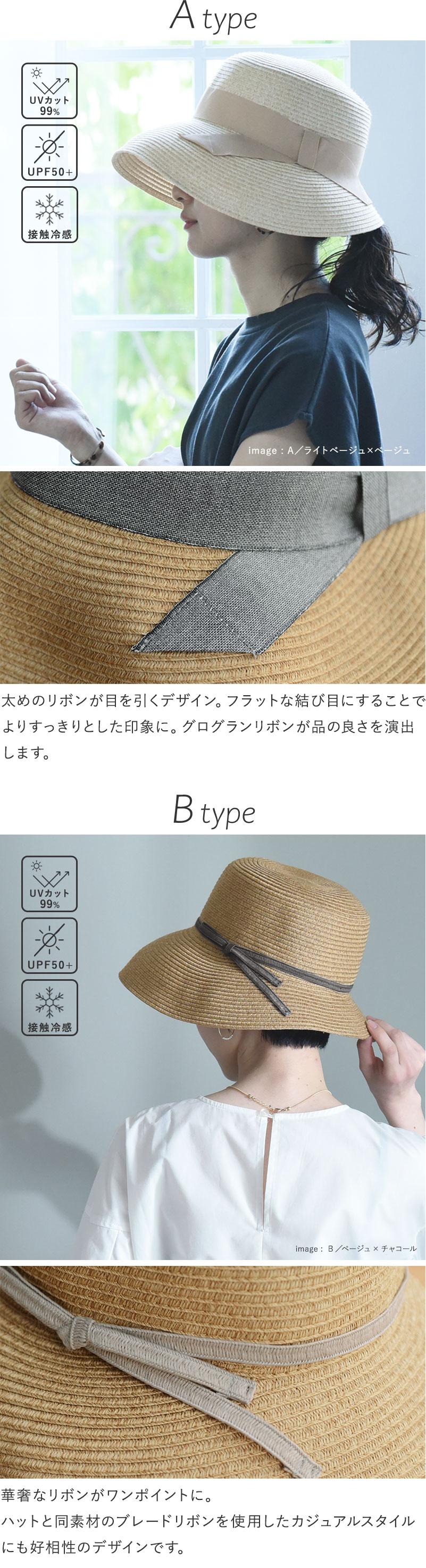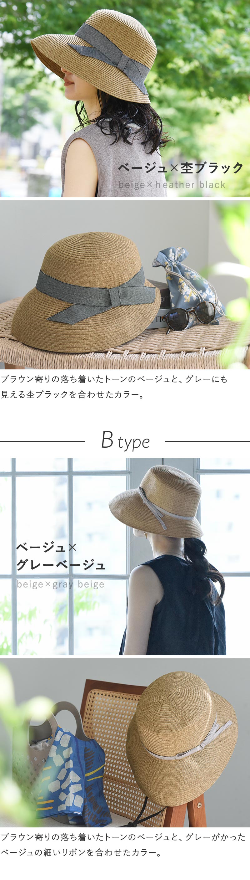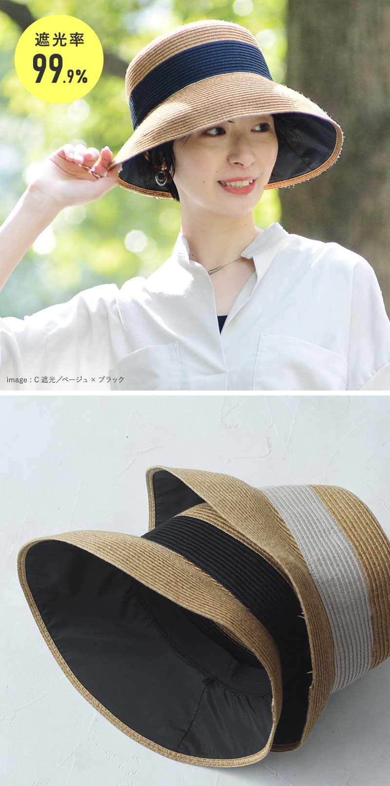 デザインはアシンメトリーシルエットで、リボンの太さが異なる2種類をご用意。さらに今年はツバ裏部分が遮光生地になった機能派タイプも登場しました。