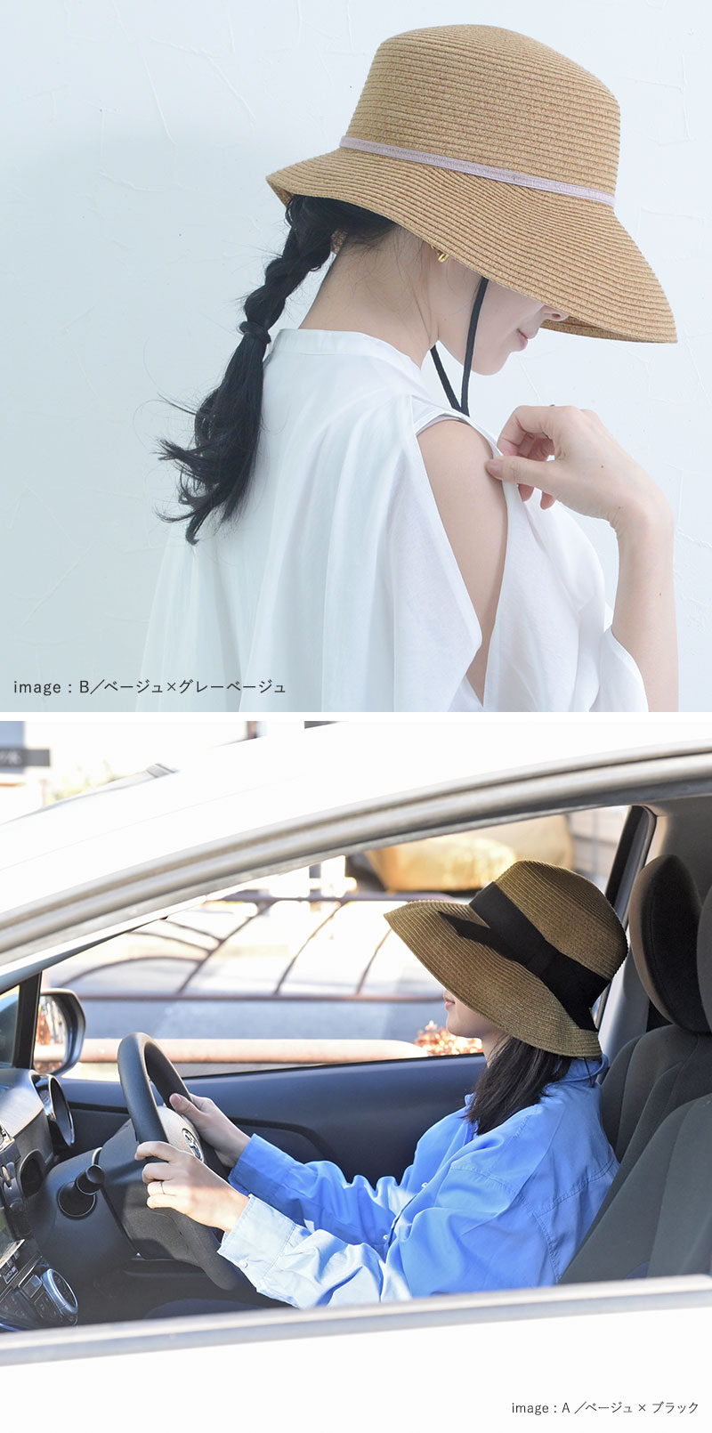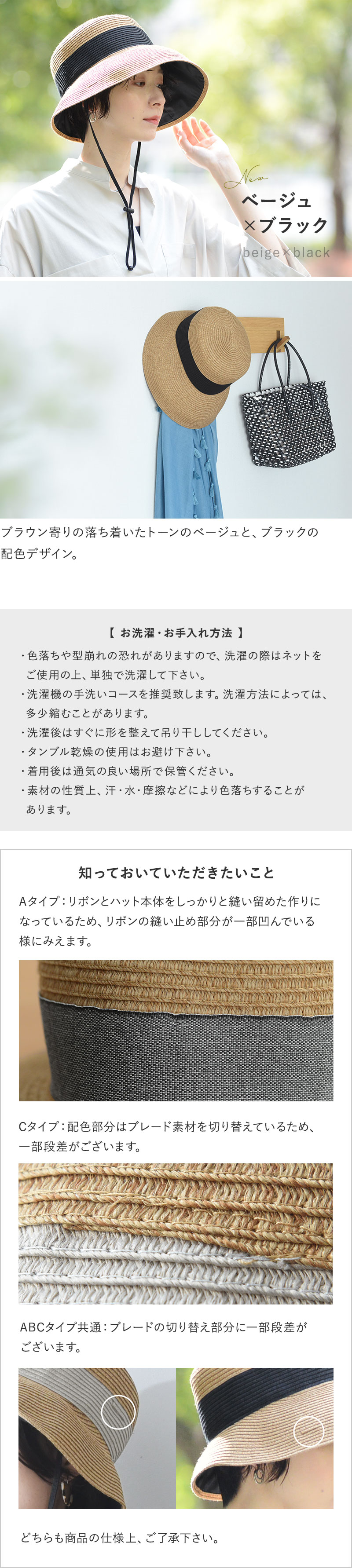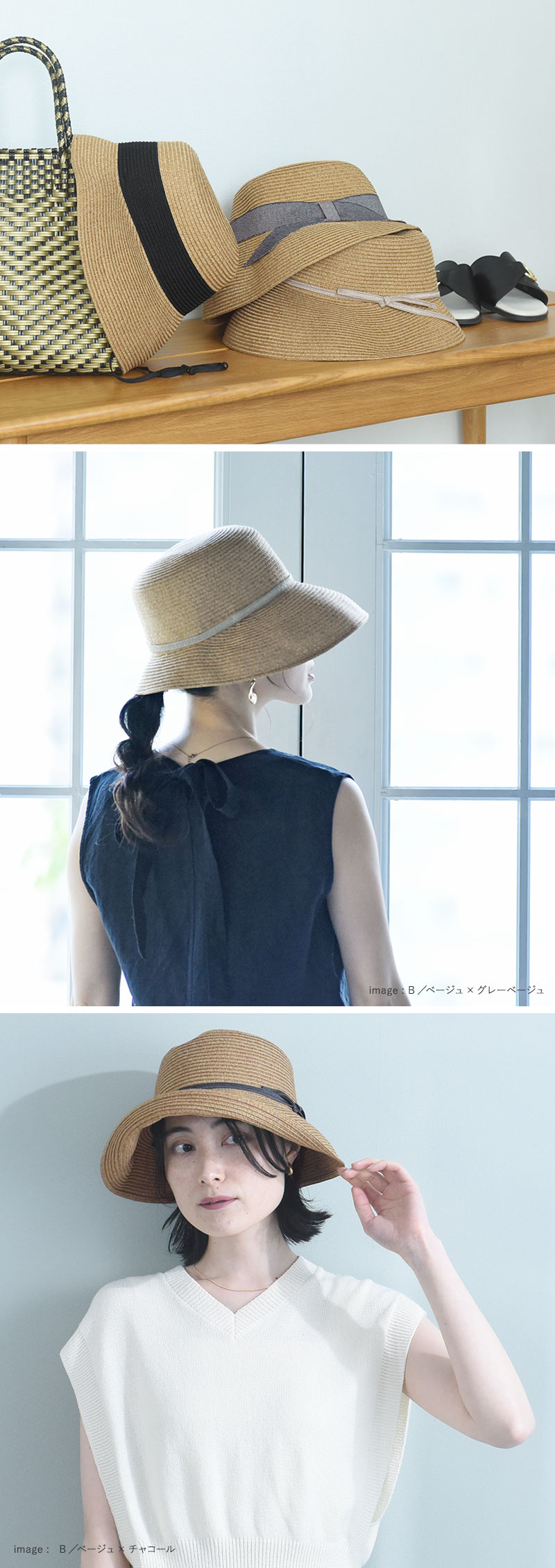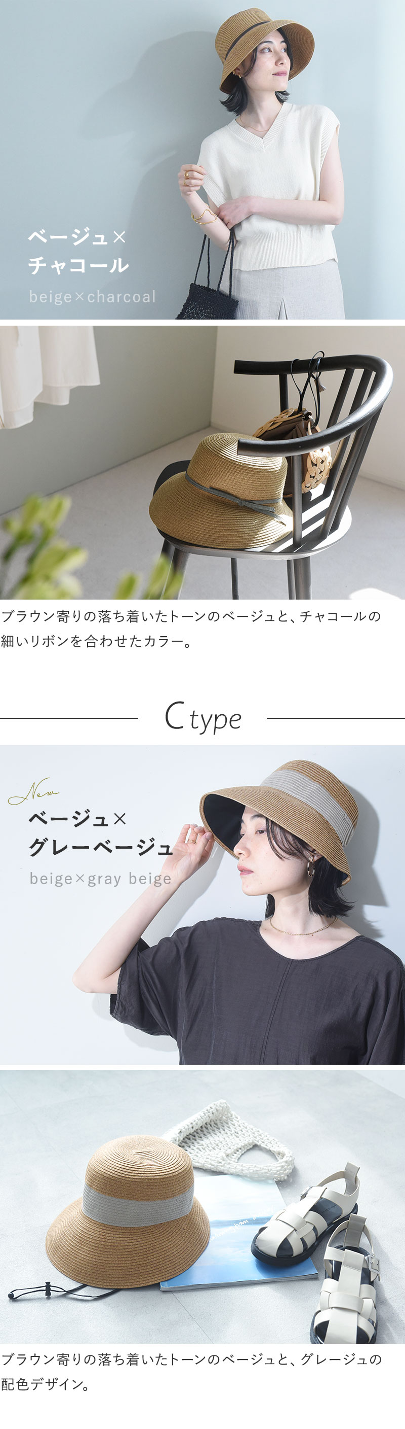 デザインはアシンメトリーシルエットで、リボンの太さが異なる2種類をご用意。さらに今年はツバ裏部分が遮光生地になった機能派タイプも登場しました。