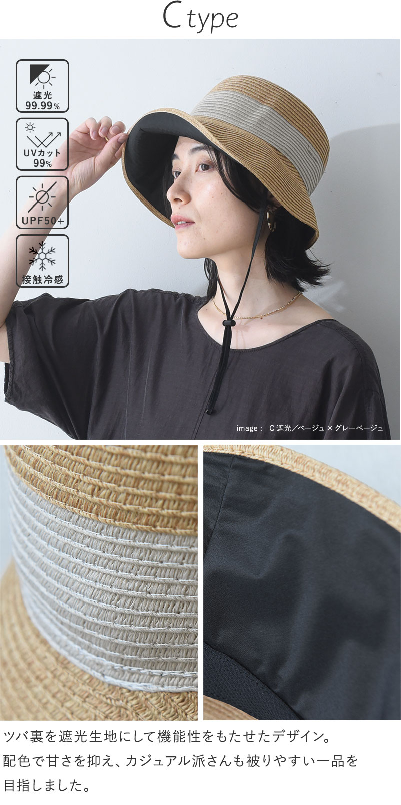 ※Cタイプのみ遮光生地をあしらっているため、裏側はブラックの生地が見える仕様になります。