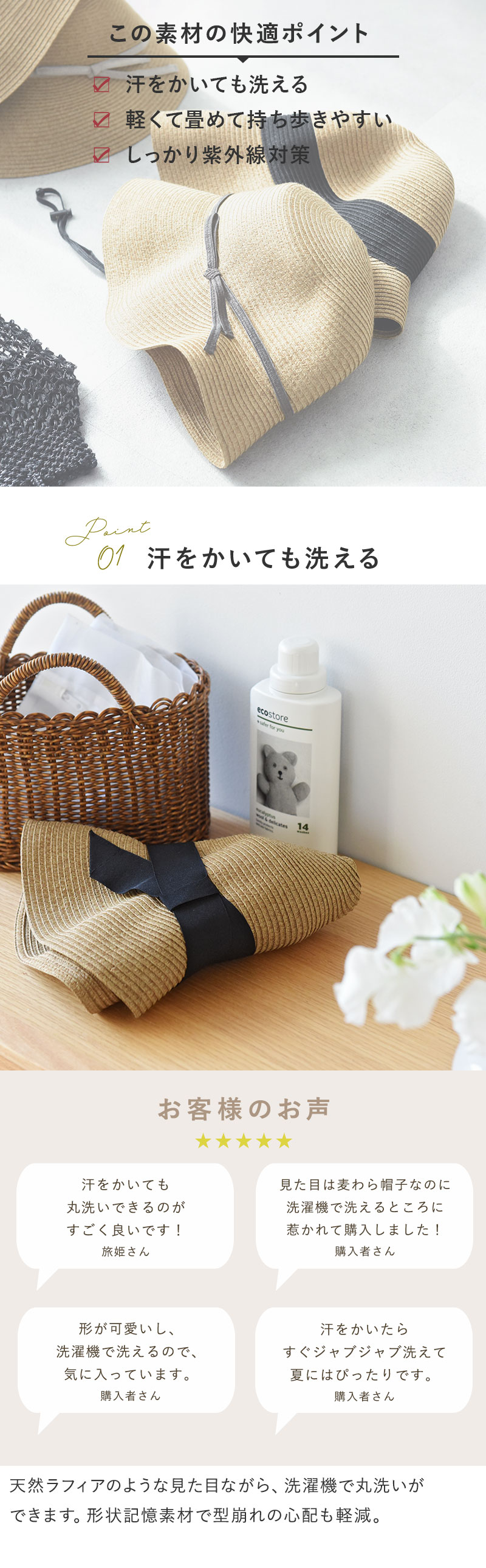 真夏以外も気が抜けない日差し対策。頻繁にかぶるものだから、ハットも常に清潔にキープしておきたいもの。こちらのブレードハットは、見た目はラフィアのようでも実は非天然素材。汗をかいても洗濯機で洗えるウォッシャブル仕様です。