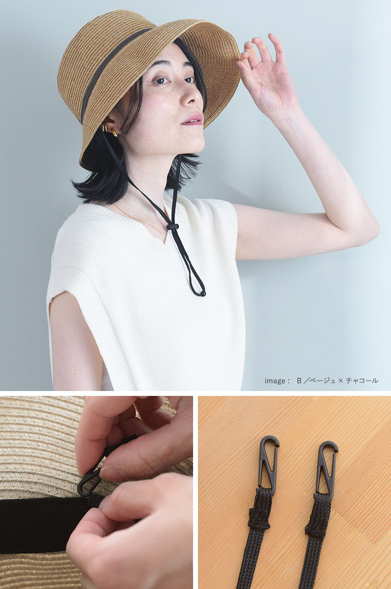 風で飛ばされない、あご紐付き全てのタイプに取り外しできるあご紐を付けています。アジャスター付きなので、長さ調整も簡単。自転車や風の強い日にも飛ばされにくくて安心です。