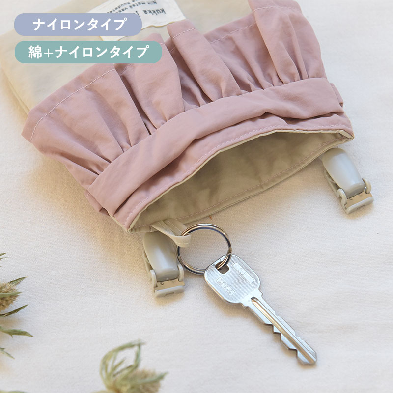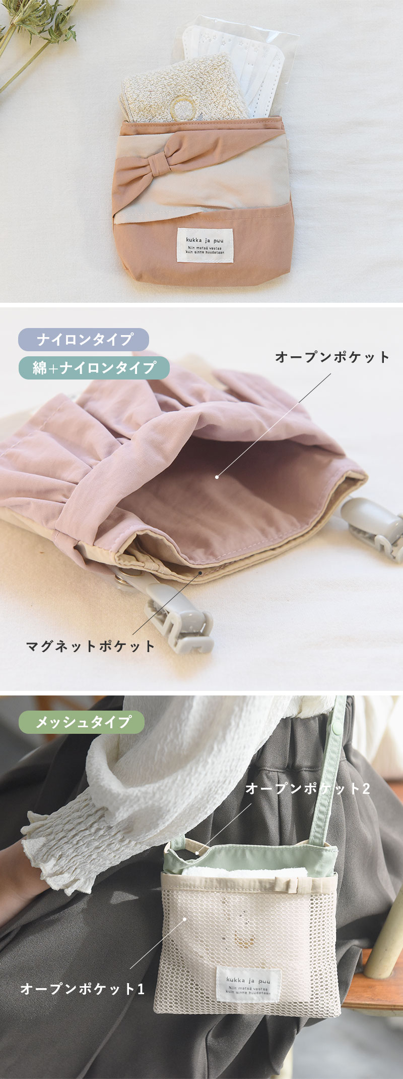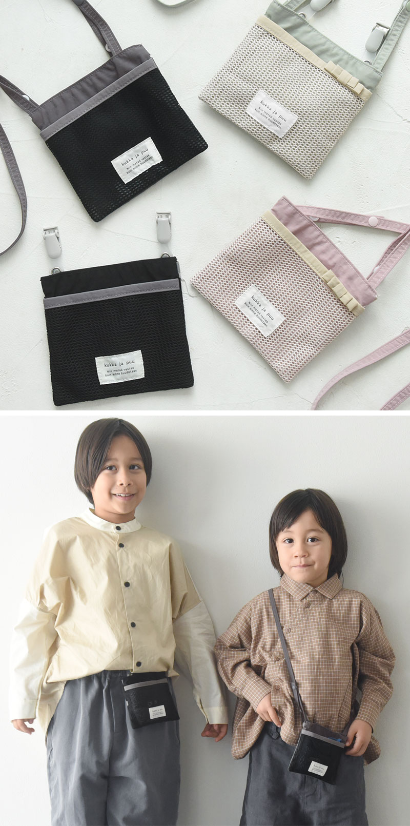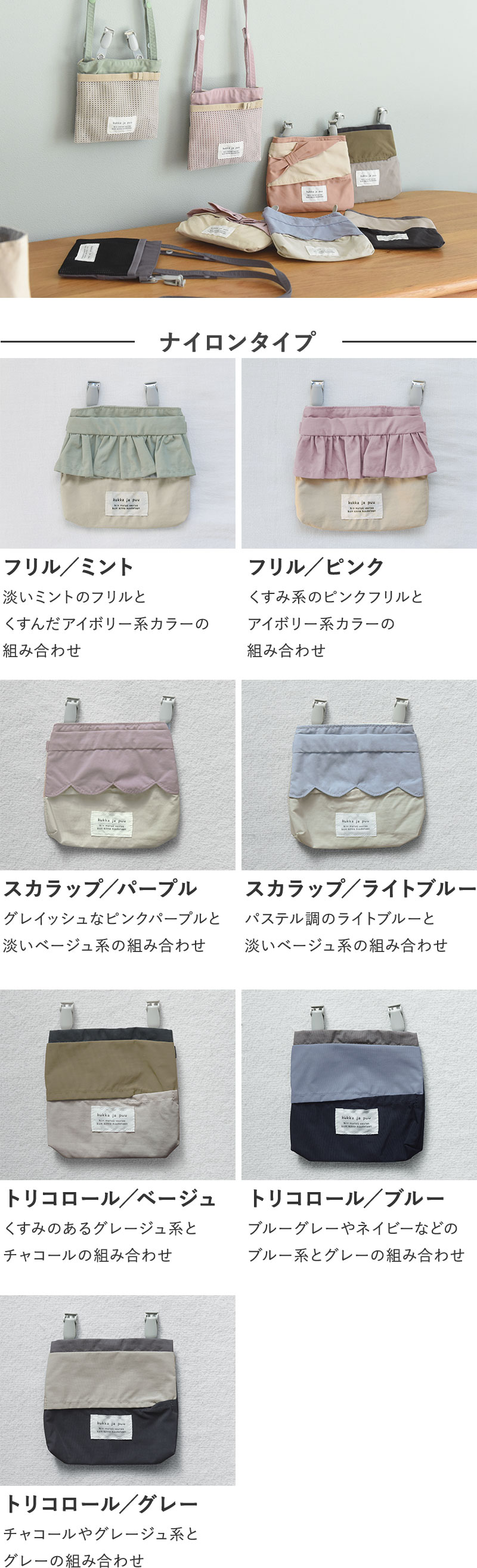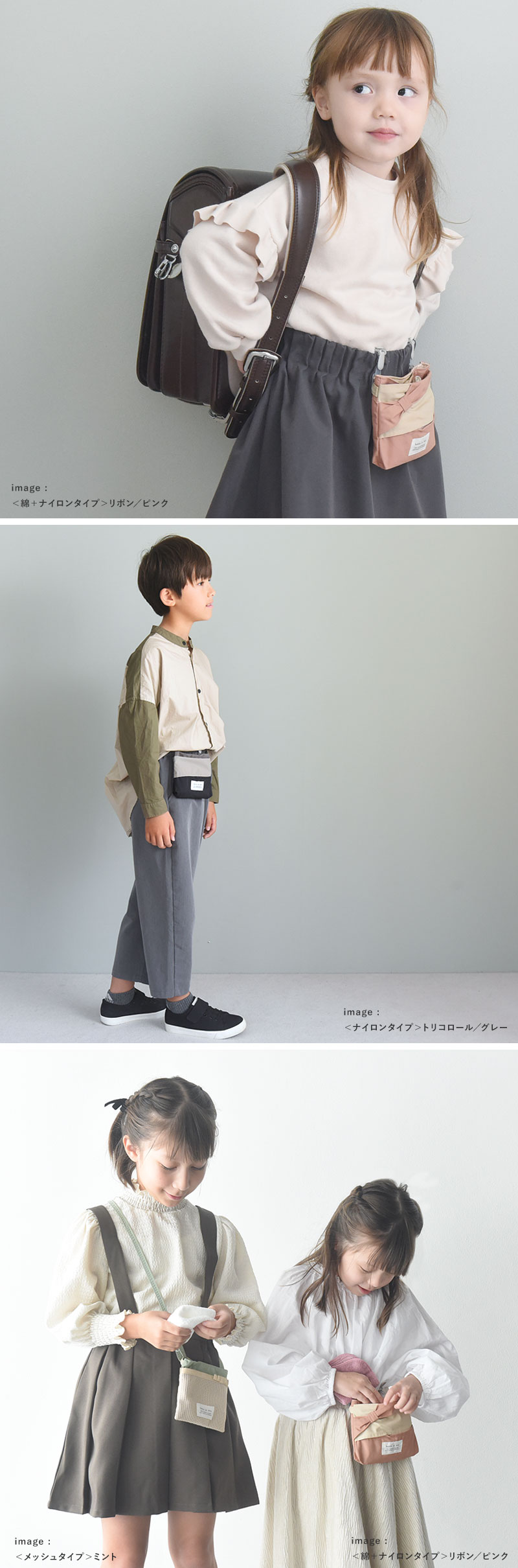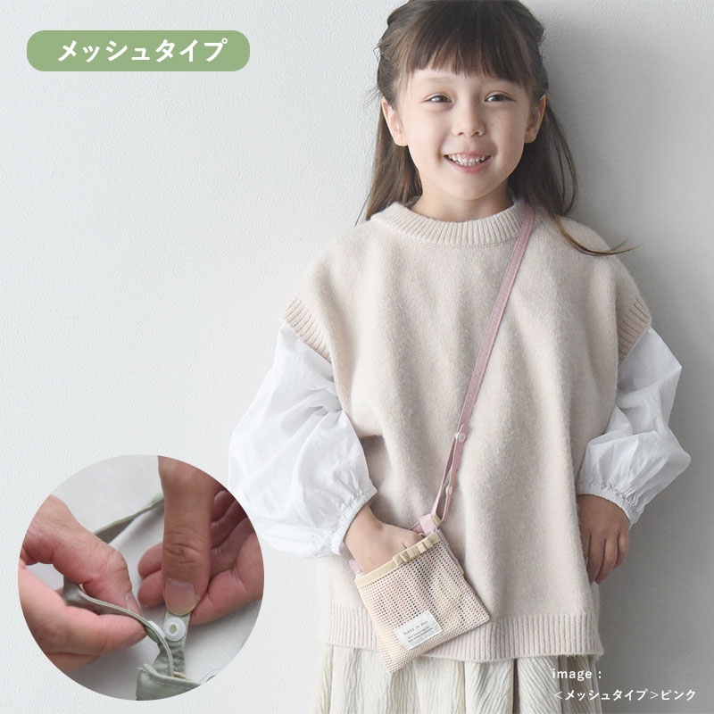 メッシュタイプはショルダー紐付きワンピースやチュニックを着ていてクリップをつけられない時は、ショルダー紐でポシェットとして持つことができます。