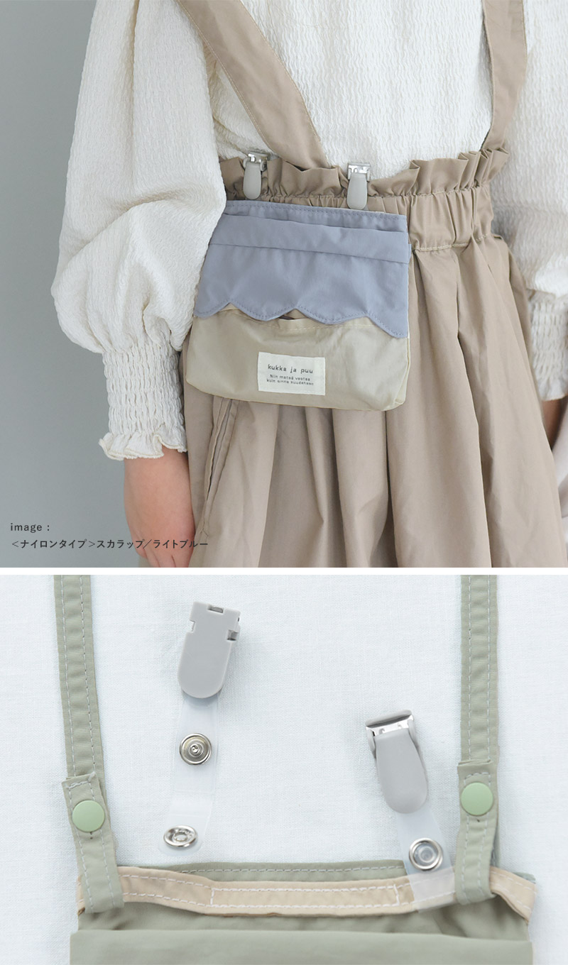 クリップ付きで取り外し簡単ポケットの装着はクリップ式。しっかり留められるのに、取り外しは簡単です。