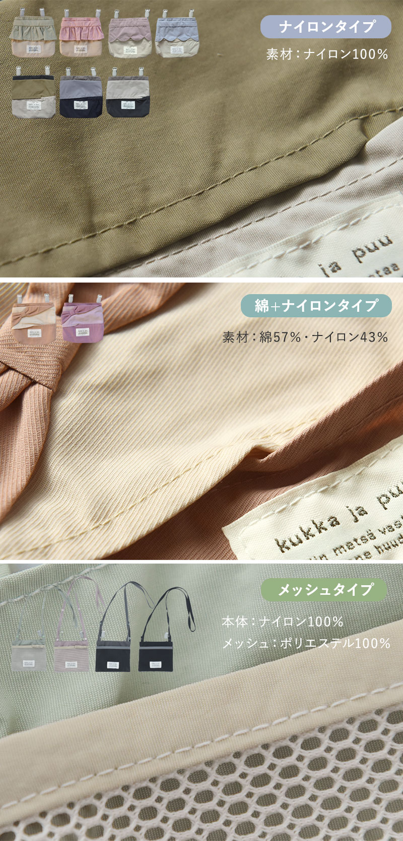 いずれのタイプも耐久性のある生地を使用しています。光沢感がないマットな素材で落ち着いた印象だから、いろいろなお洋服と相性◎です。