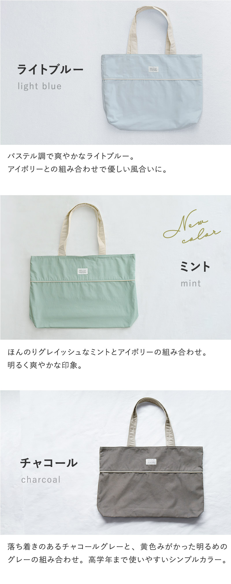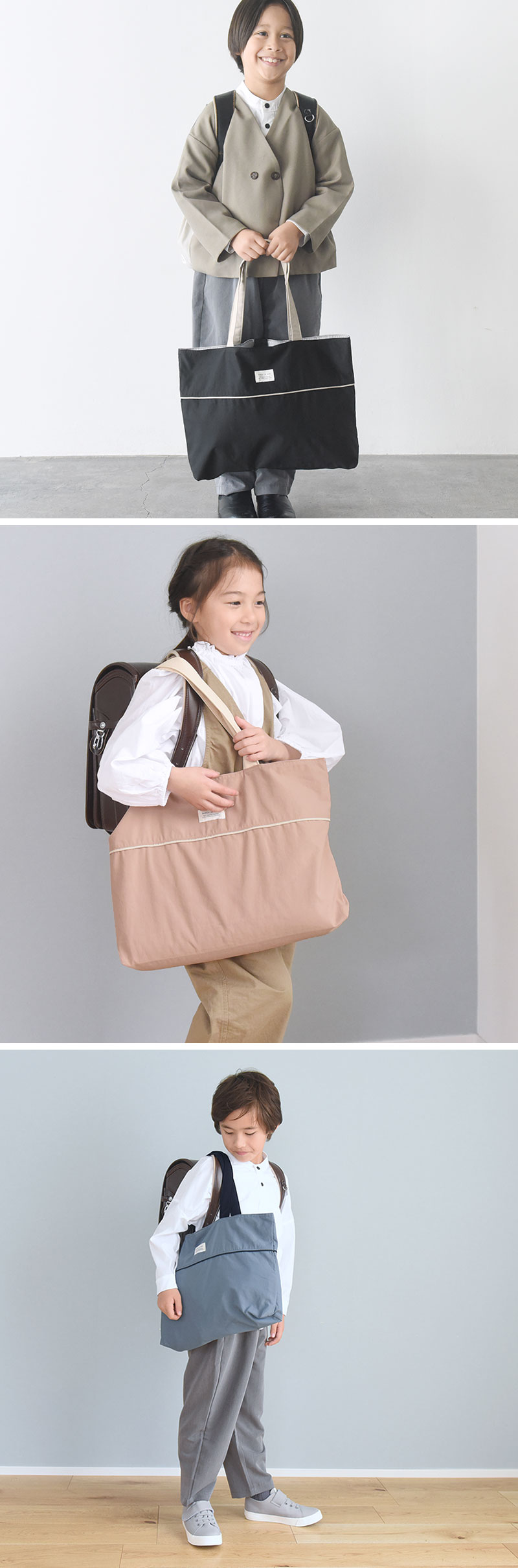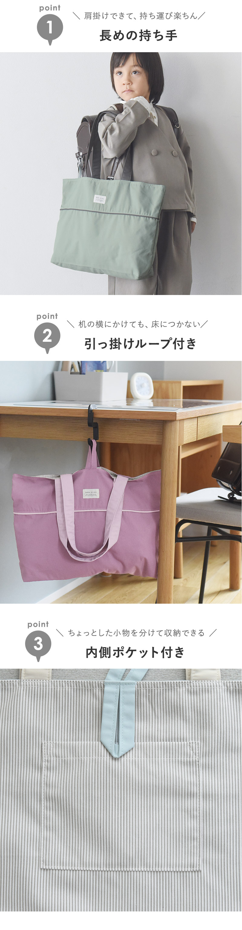 お道具箱もすっぽり入るサイズ感だから、大荷物のキッズたちに◎。体操服、上履きなど持ち帰りが多い週末も、これならひとつにまとめて入れることができます。また、引っかけループ付きで、机の横にかけても床に付かないという工夫も。