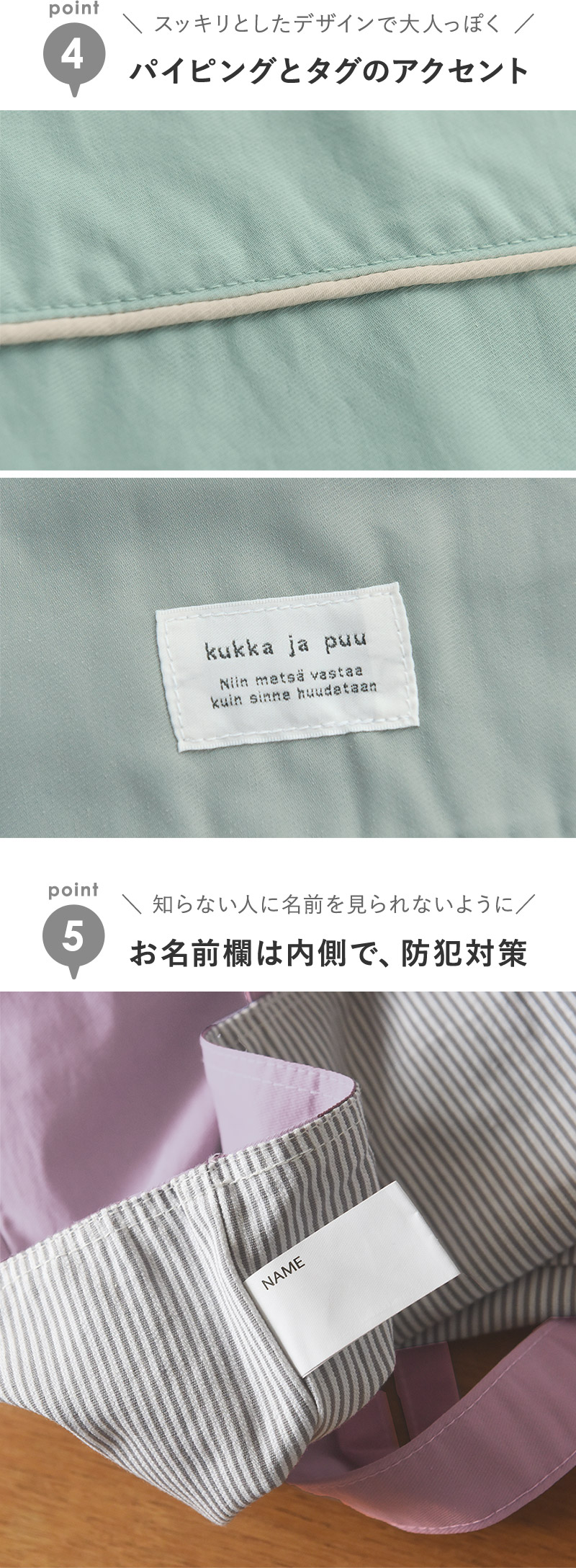 お子様のご入学に向けた準備に。kukka ja puu(クッカヤプー)の落ち着いた北欧カラーの「マチありレッスンバッグ」です。