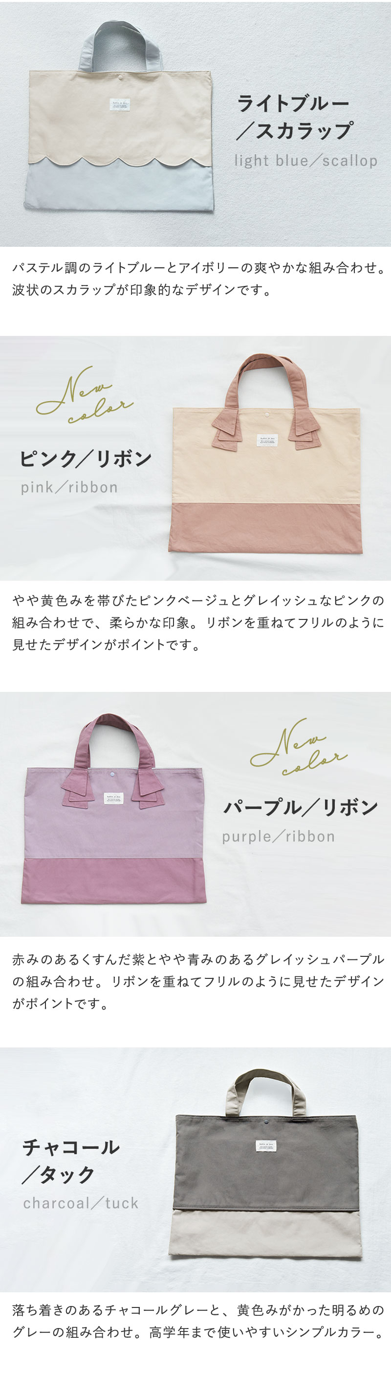 どれもシンプルでありながら程よいアクセントを加え、子どもたちが「持ちたい!」と思えるデザインを目指しました。