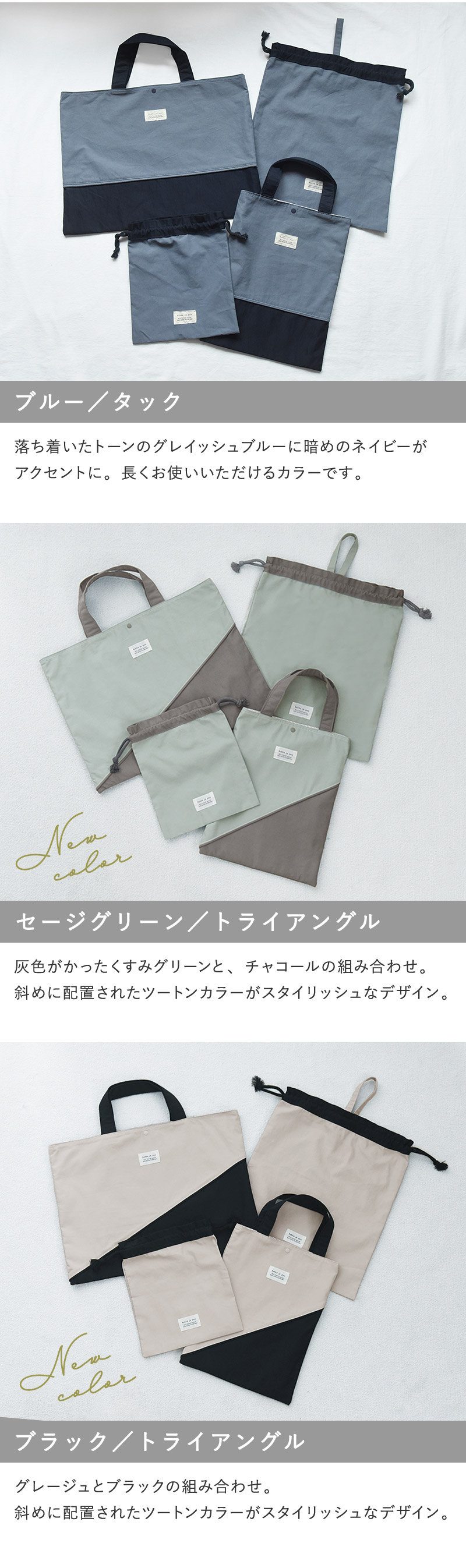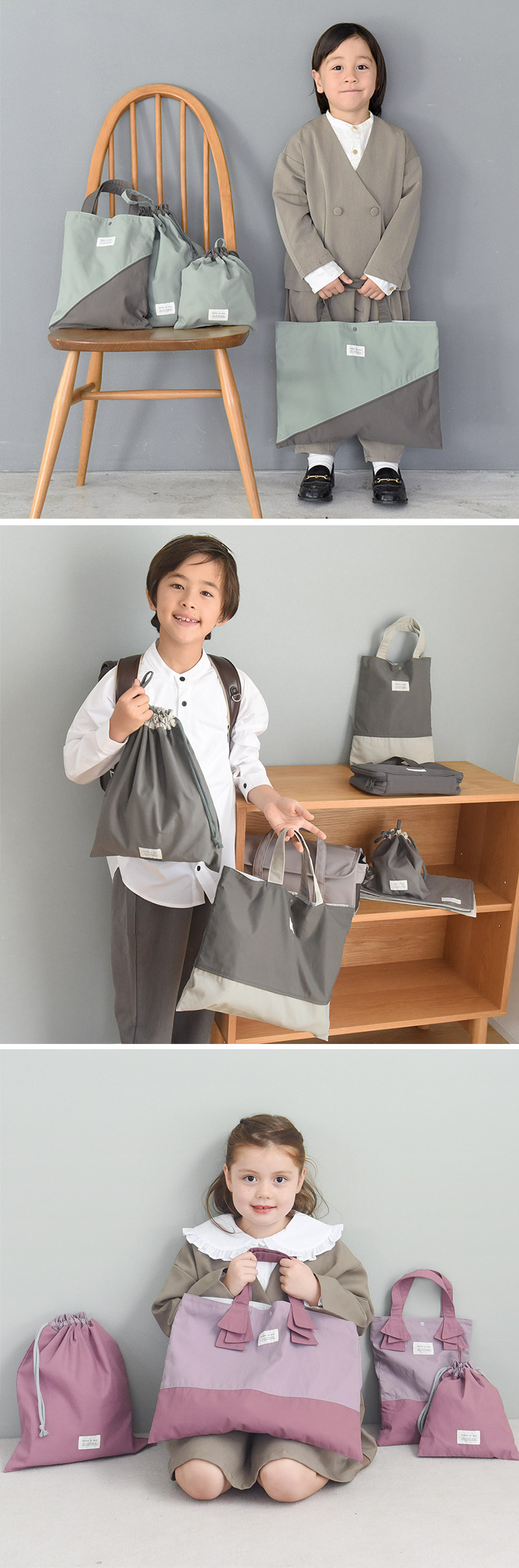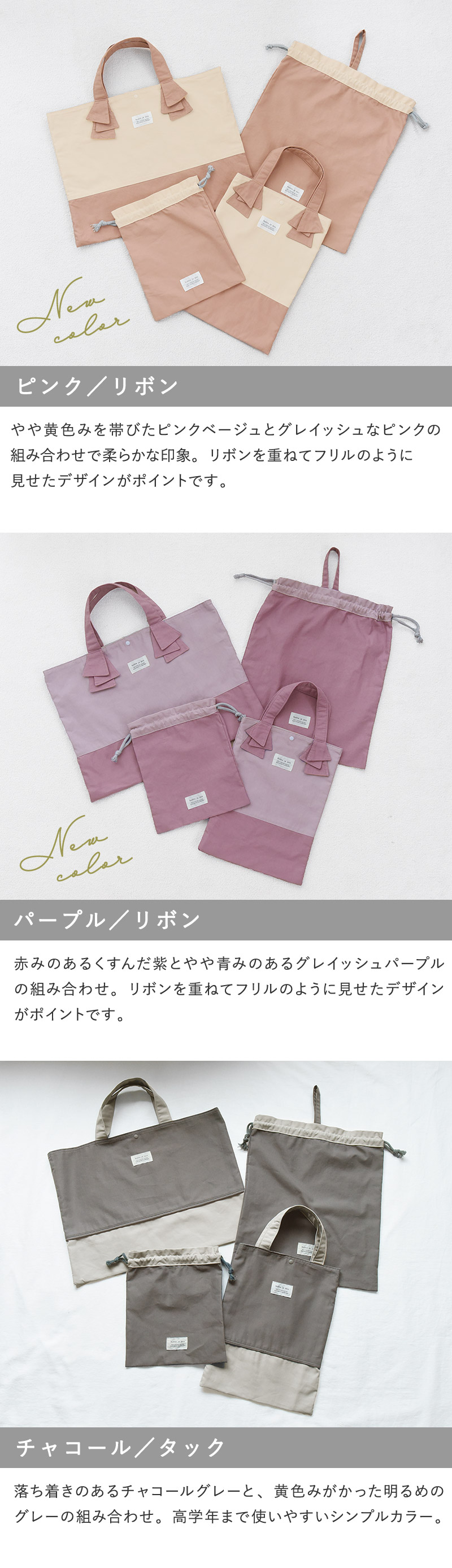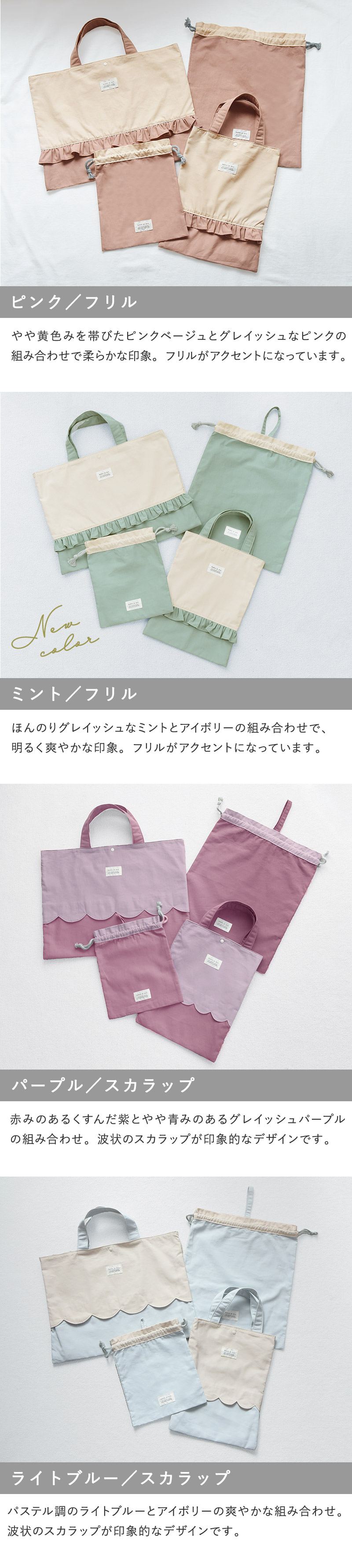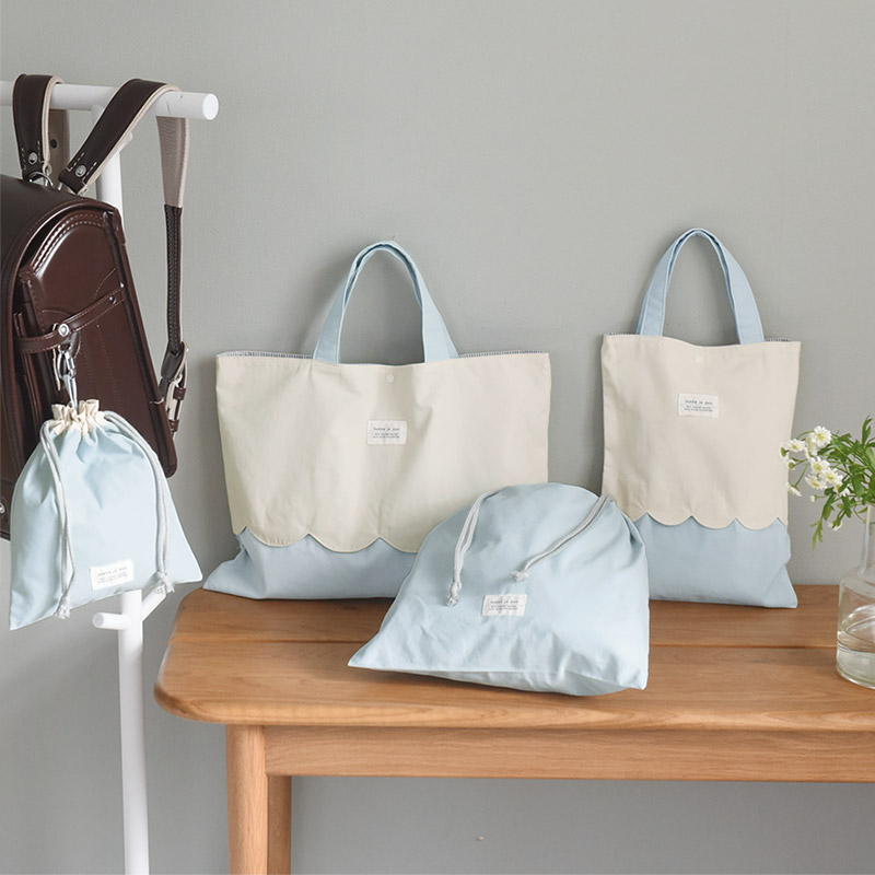 入園準備に必要となる「レッスンバッグ」、「シューズバッグ」、「巾着大(体操着入れ)」、「巾着小(ランチョン入れ)」の4アイテムが、統一感のあるデザインで揃えられたセット。