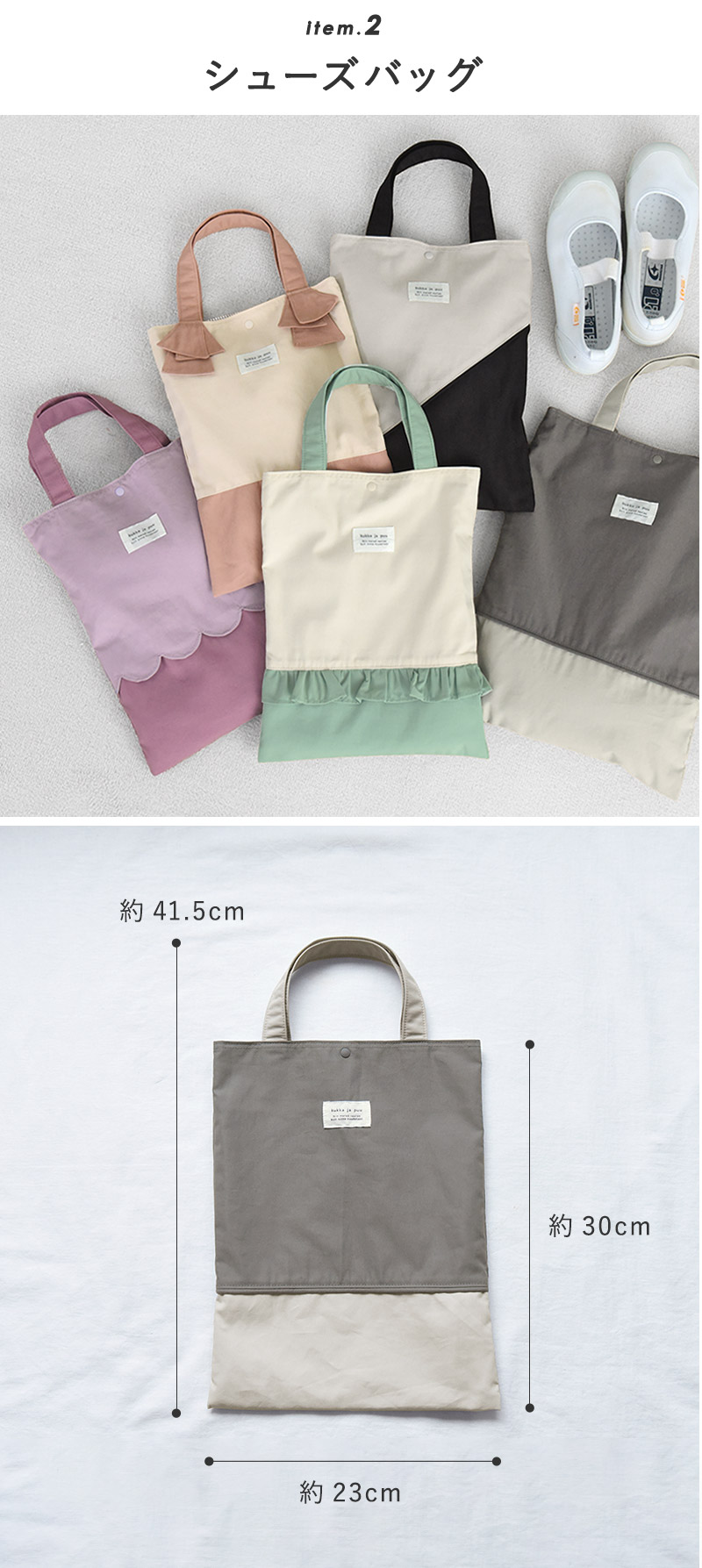 靴を出し入れしやすいサイズ感ミニトートのようなデザインは、お子様でも持ち運びやすく、上履きを出し入れしやすいのもポイント。