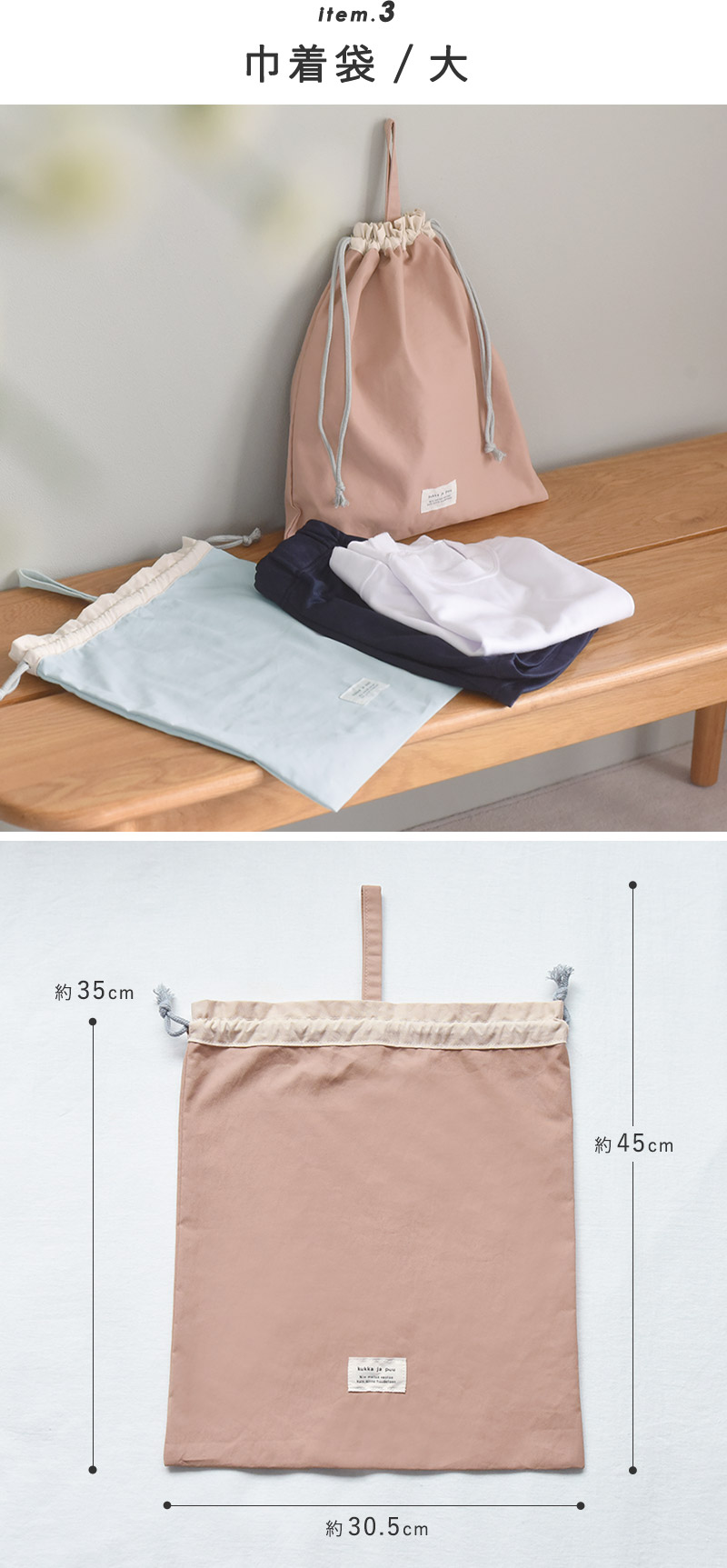フックがけしやすい持ち手持ち運んだり、学校机のフックにかけるのに便利な持ち手付き。体操服に加え、冬場のトレーナーも入れられるたっぷりサイズです。