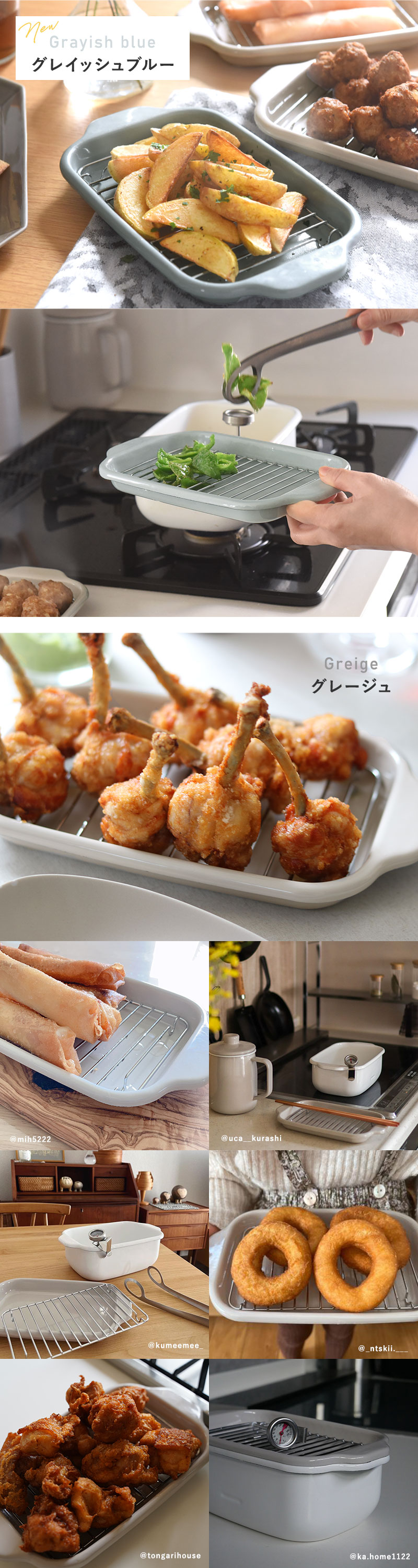防水型の温度計・トレイ・すのこ網がセットになっているので、手軽に揚げ物料理にチャレンジできます。