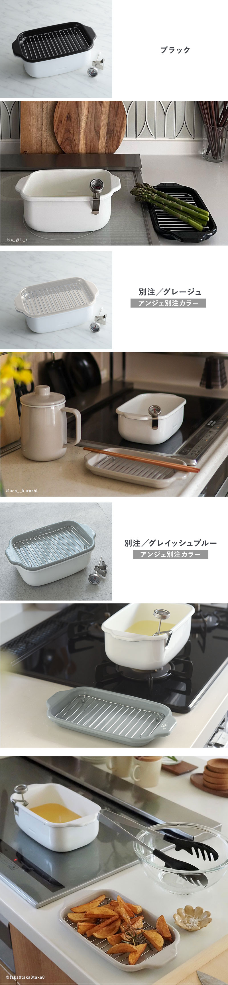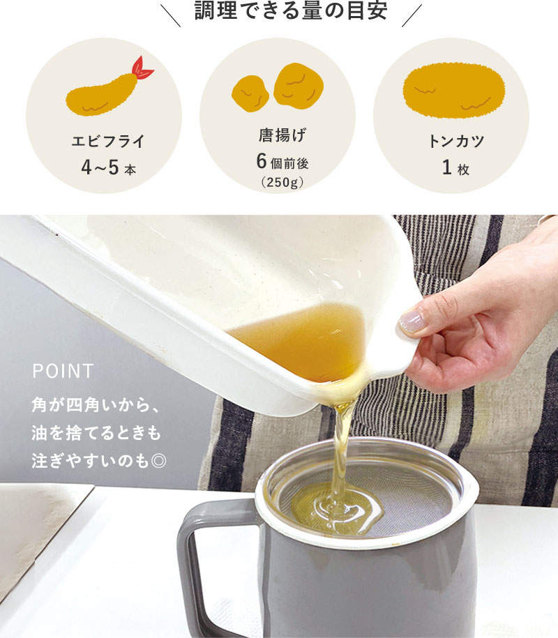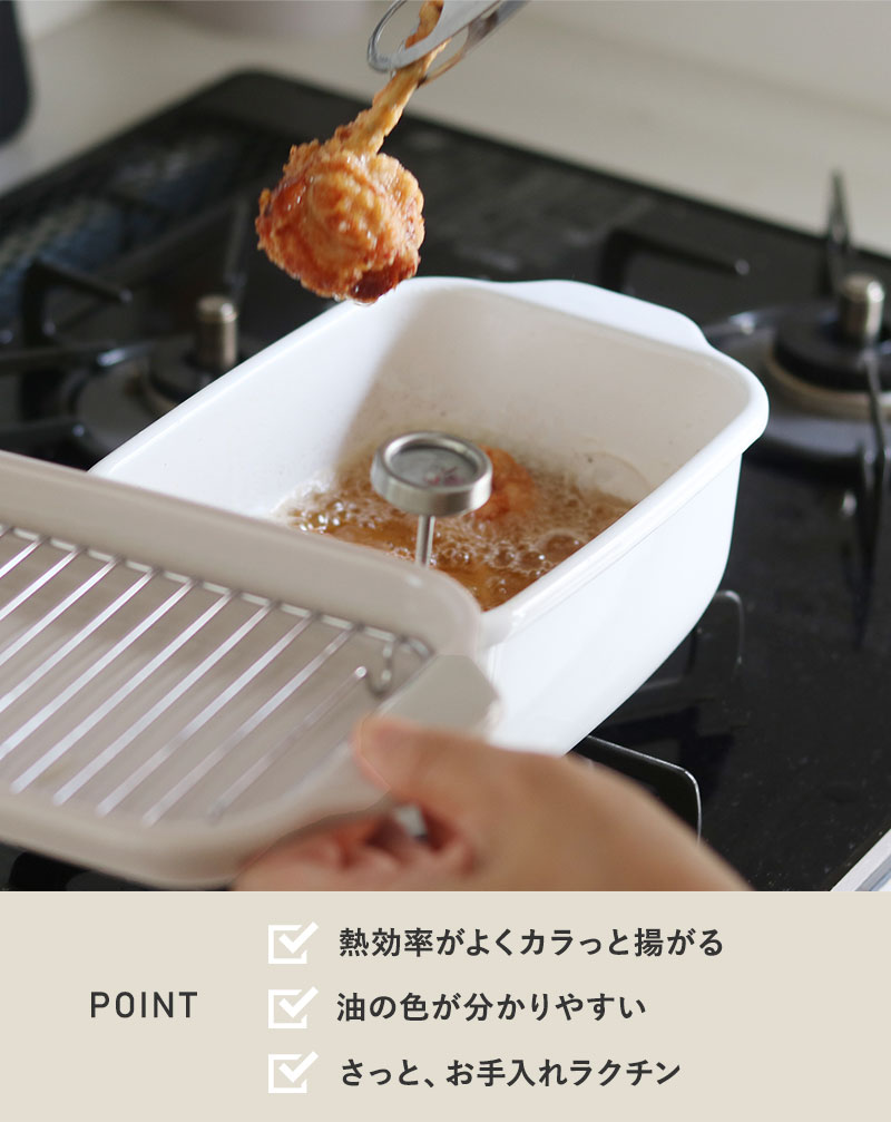 カラッと揚がる熱効率の良さこちらの本体は琺瑯製だから熱効率に優れカラッとした仕上がりに。内側も白色なので油の状態がひと目でわかるのも◎。