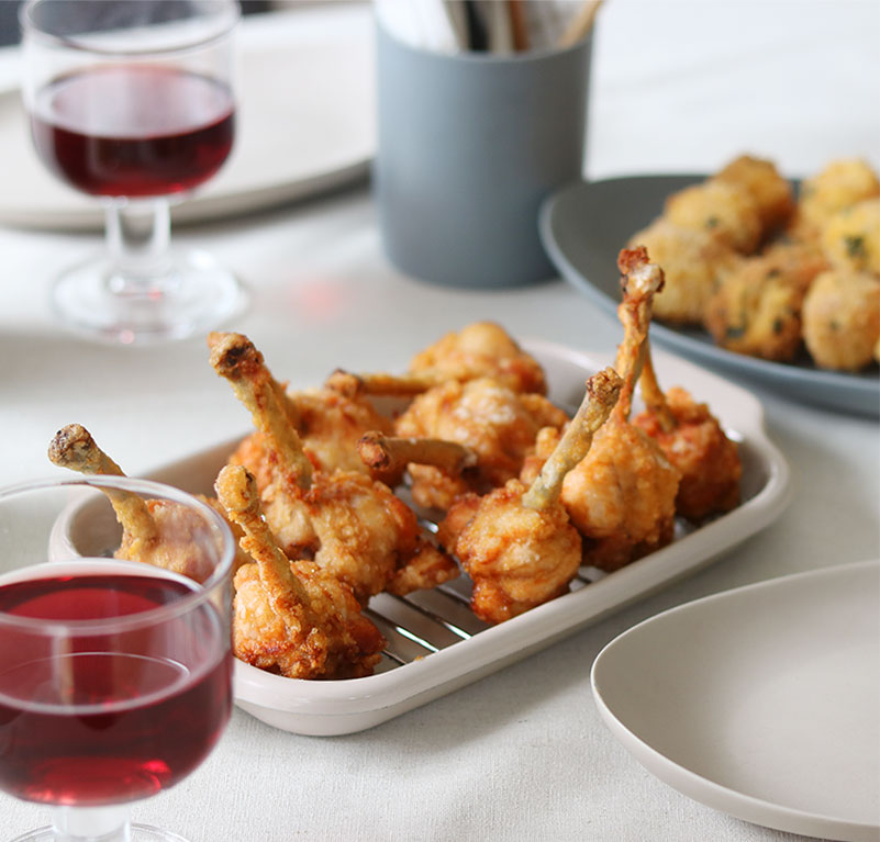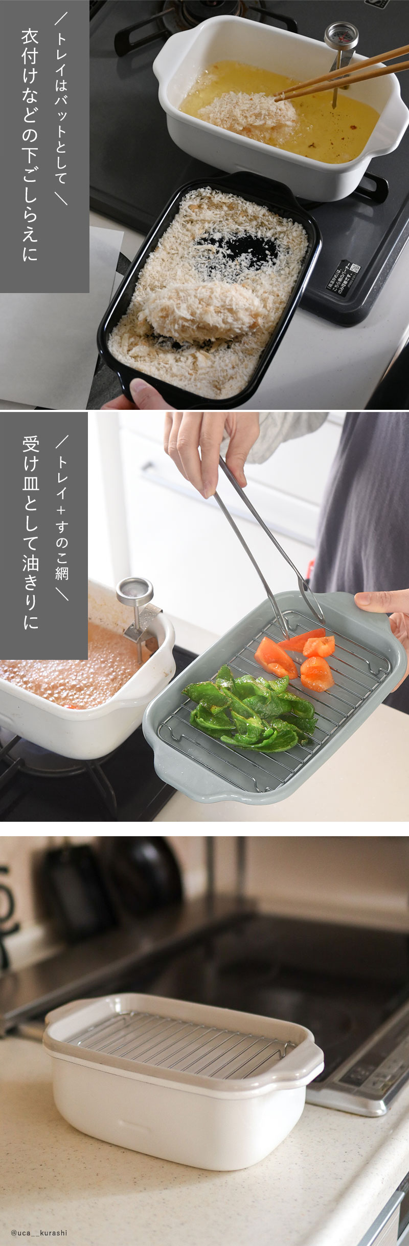 どちらのバットもテーブルで食器のように使えるカラーだから、揚げたてのおかずをサーブしたり、卓上で串揚げパーティーを楽しむ時にも活躍します。