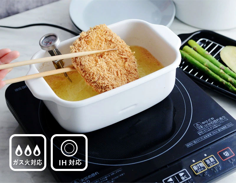 ガス、IH、ハロゲンヒーターなど様々な熱源で使用可能。卓上にも映える琺瑯製だから、IHヒーターを使って卓上で串揚げも楽しむことができます。