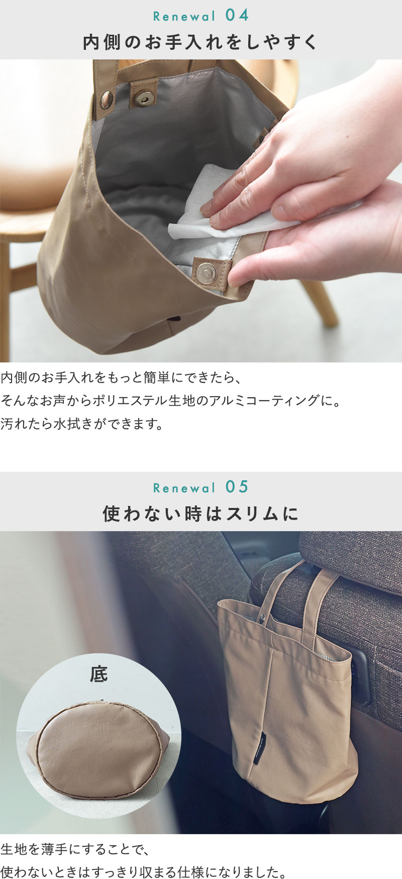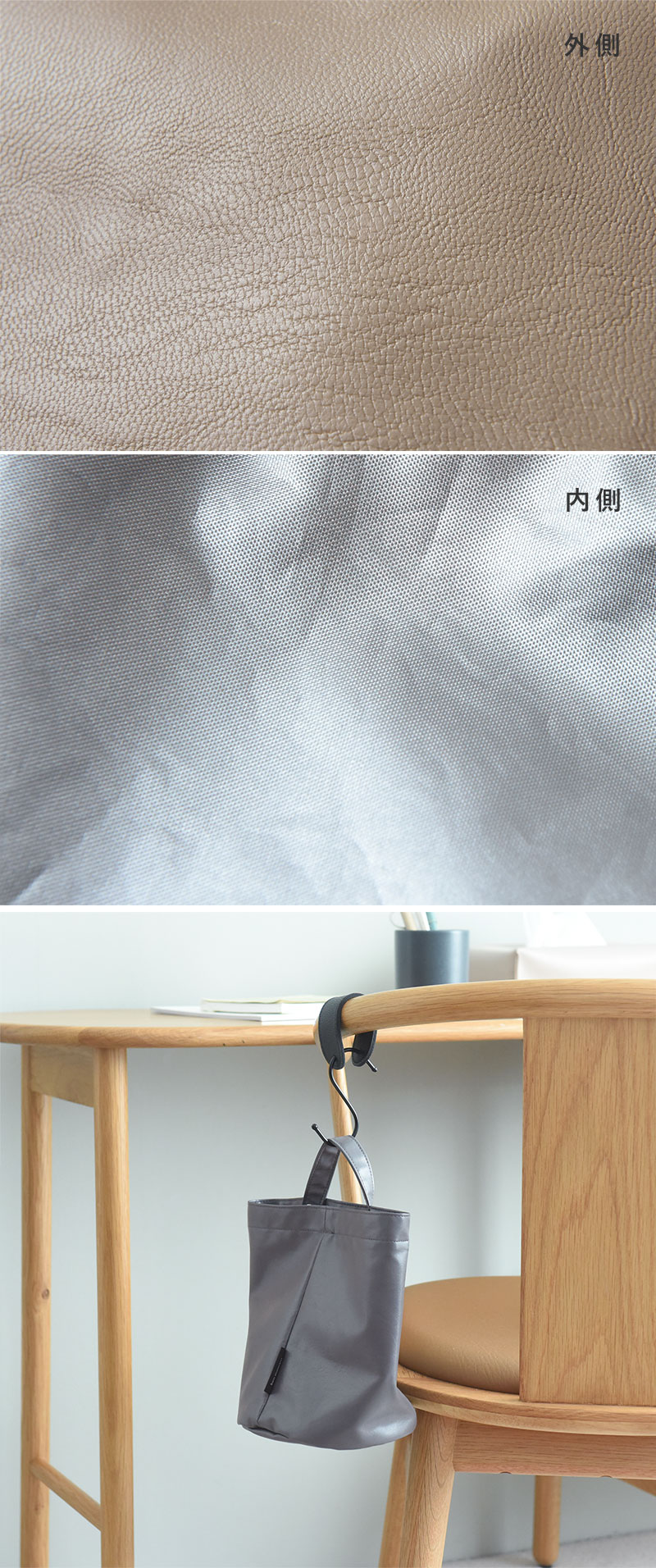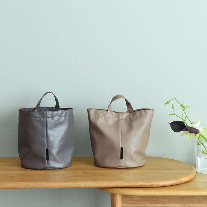 素材はニュアンスカラーのフェイクレザー。生活感が出にくいルックスも◎。