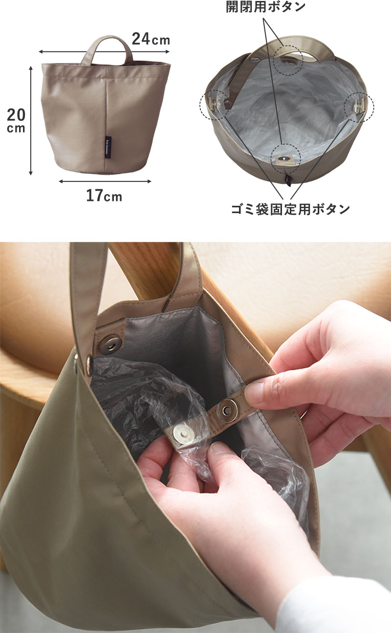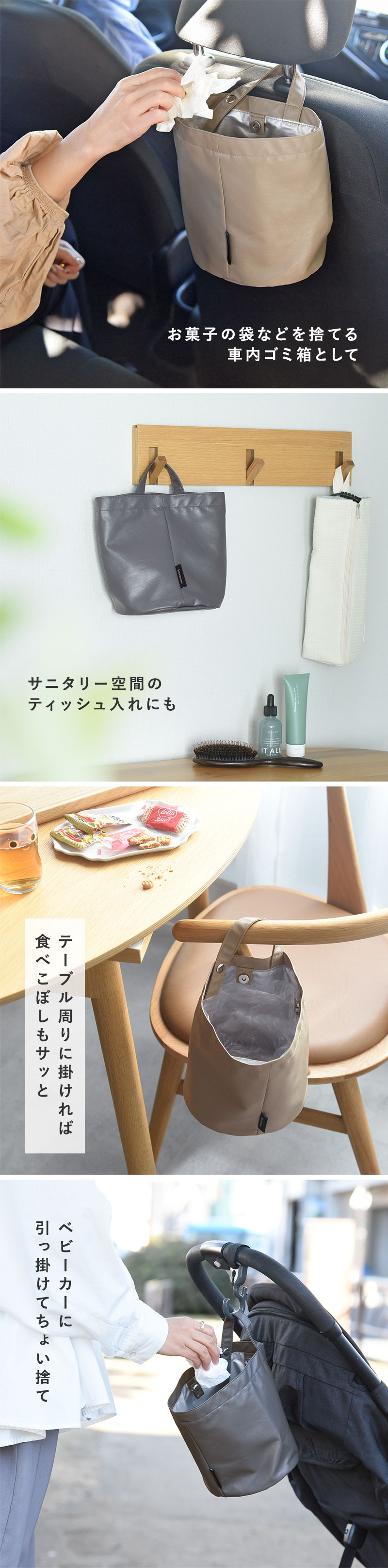 サニタリーに置けば、綿棒やコットン、コンタクトレンズの空ケースもちょい捨て。車の中など狭い場所で使ったり、ベビーカーにも取り付けやすい、吊り下げ式のデザインです。