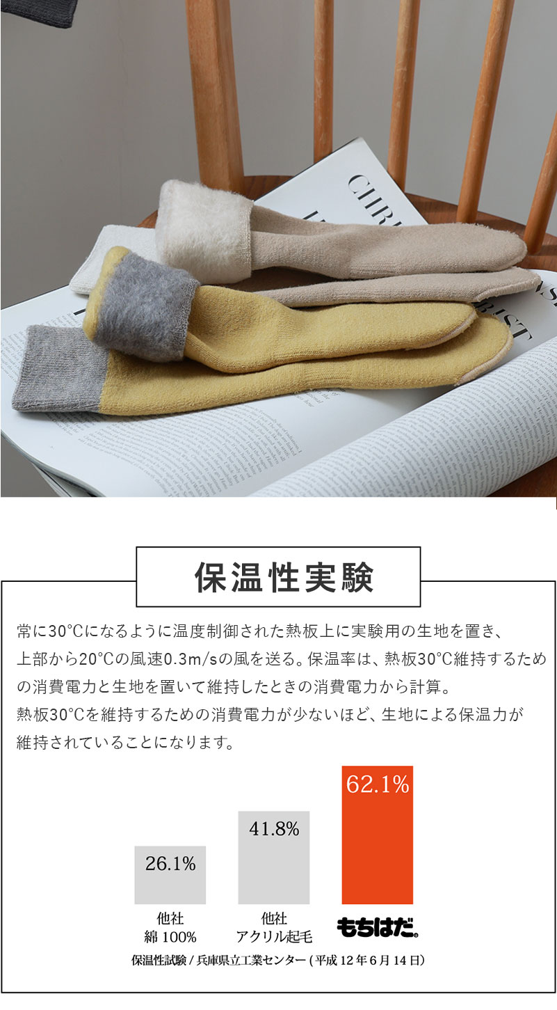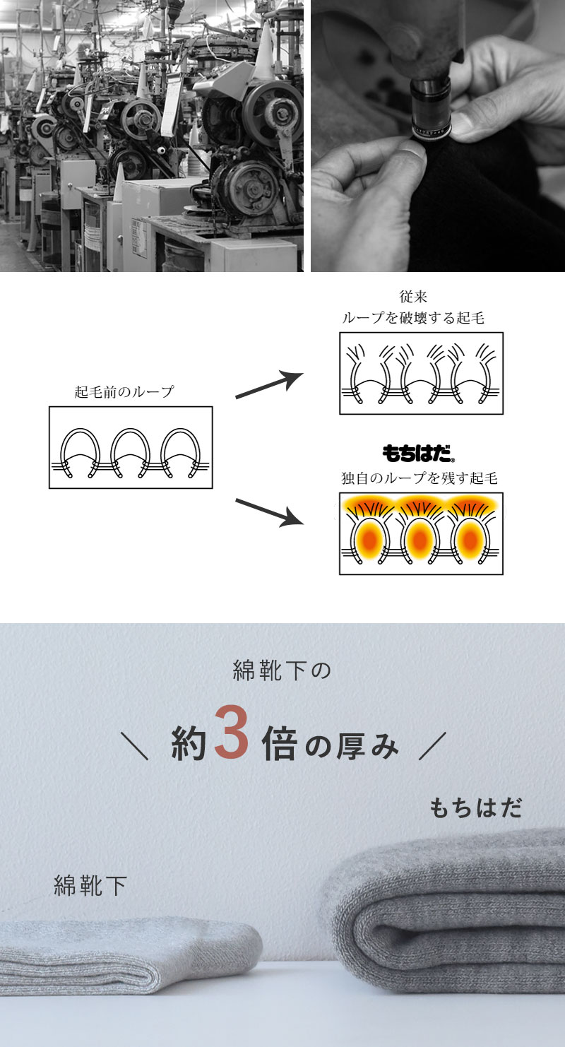 登山家・植村直己さんも、山登りの際に愛用するほどの極上のヌクヌク感。ワシオ株式会社がつくる「もちはだ®」のルームソックスは、ワシオさんしか作れない門外不出、唯一無二の独自の起毛技術による抜群の保温性。履いたときの肌触りもフワフワで、まるで毛布の中に足を入れたような気持ちよさなんです。